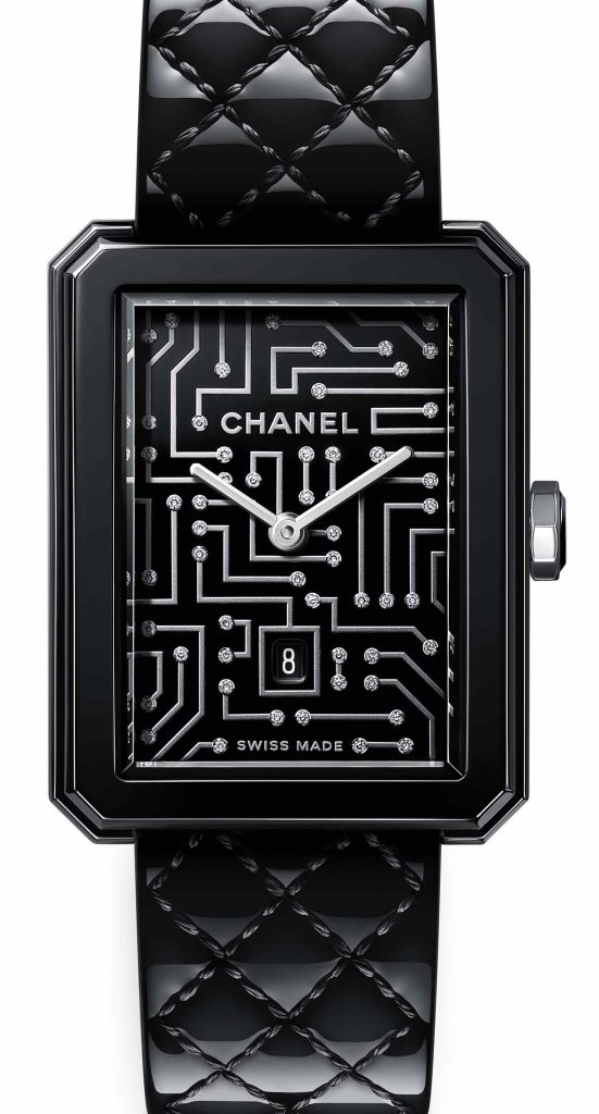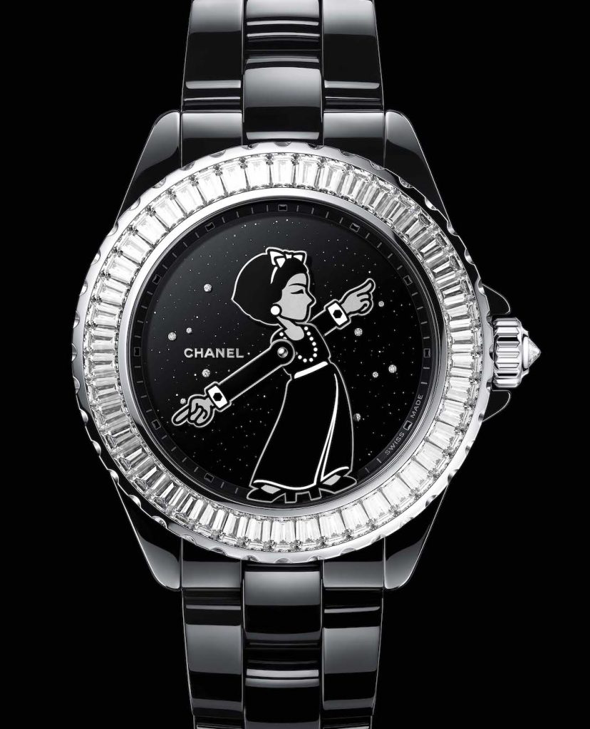 PER I J12: quattro versioni con diamanti: 12 esemplari X-Ray Star in oro bianco con movimento meccanico a carica manuale; 55 Tourbillon diamant in ceramica e lunetta in oro bianco, 20 Star Light in oro bianco,numerati. Un cofanetto, pezzo unico, che riunisce sette J12 Eclisse automatici in ceramica bianca/nera J12 Hyper Cibernetic 55 esemplari numerati; tutti cronometro certificato COSC, come l’edizione limitata del J12 Cibernetic; entrambi con disegno a pixel bianco/nero. E ancora dodici esemplari del J12 Spazio Temporal in ceramica bianca/nera, oro bianco e diamanti e movimento automatico certificato COSC. Per arrivare ai 55 esemplari Night Star ø 38 e 33 mm con il quadrante attraversato da una cometa in movimento. O al delizioso Cosmic Mademoiselle, (nella foto di apertura) che sul quadrante dei 55 esemplari ha la figurina di Mademoiselle Coco con le braccia che indicano le ore (movimento automatico Calibro 12.1 certificato COSC, cassa ceramica nera, lunetta in oro bianco con diamanti). Infine in edizione limitata il J12 automatico monocromatico nero o bianco in ceramica e acciaio, certificato COSC e cassa w.r. a m.200.