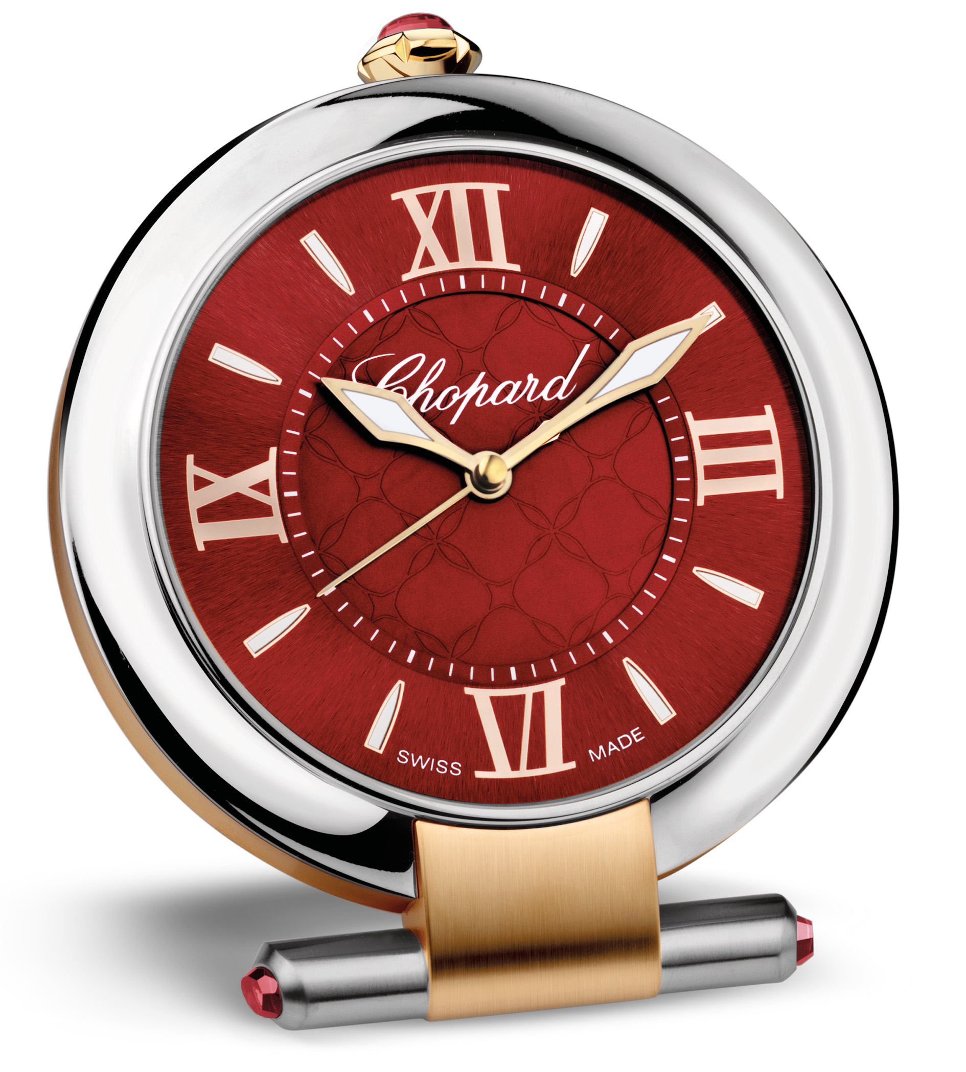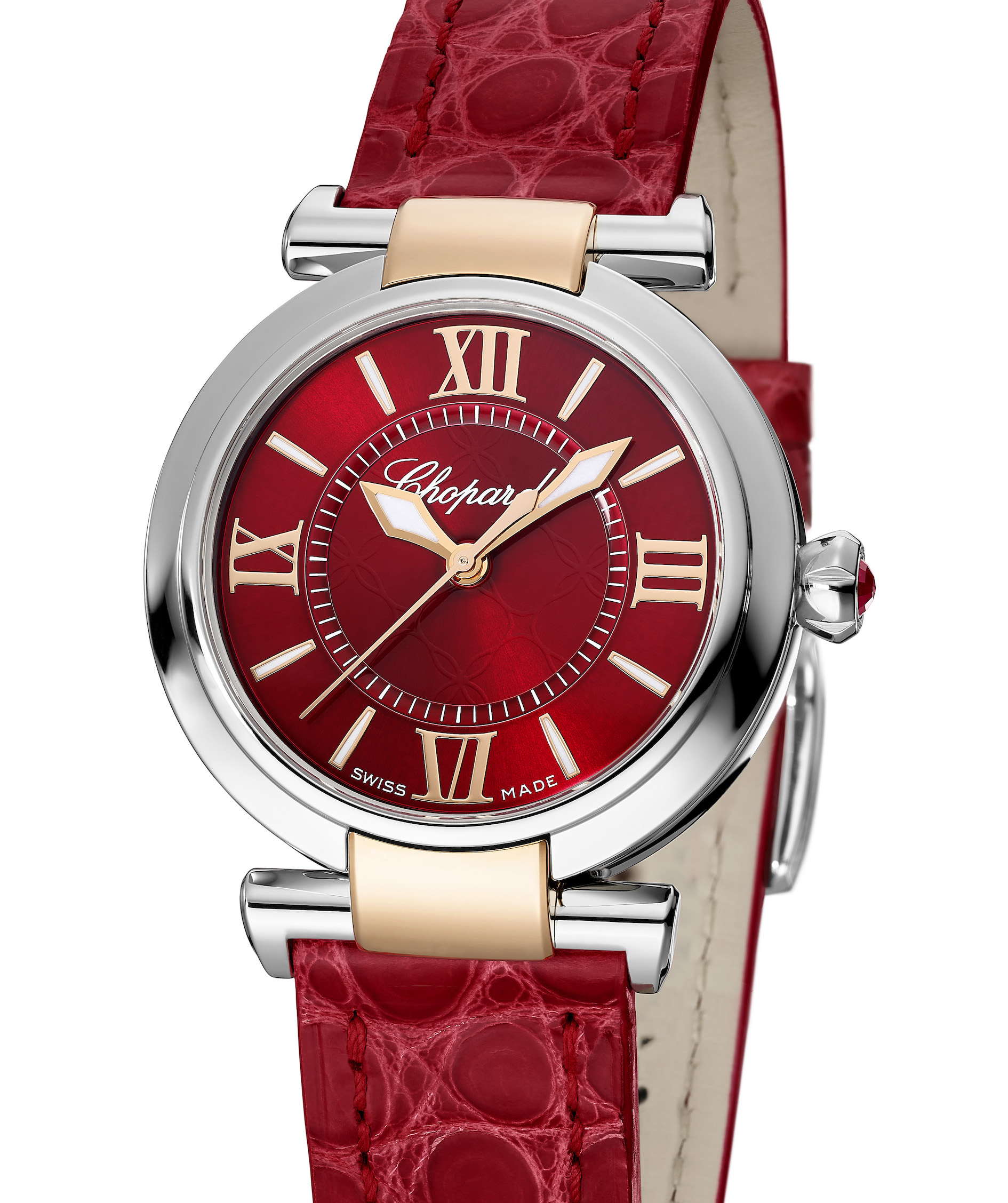 La cassa ø 29 mm del nuovo Imperiale in acciaio inossidabile con analoga lunetta e copri anse in oro etico rosa, accoglie il movimento automatico Calibro Chopard 09.01-C (25.200 A/h, 27 rubini, carica 42 h) visibile dal fondello; la corona in acciaio, che ricorda il fior di loto, incastona un rubino; al centro del quadrante satinato soleil rosso, un motivo impiegato anche sugli altri modelli della collezione, ispirato alle decorazioni dei cuscini sui quali venivano adagiati i simboli del potere del Re o dell’Imperatore; indici e lancette sono dorati, il cinturino in alligatore rosso brillante ha la fibbia ad ardiglione.