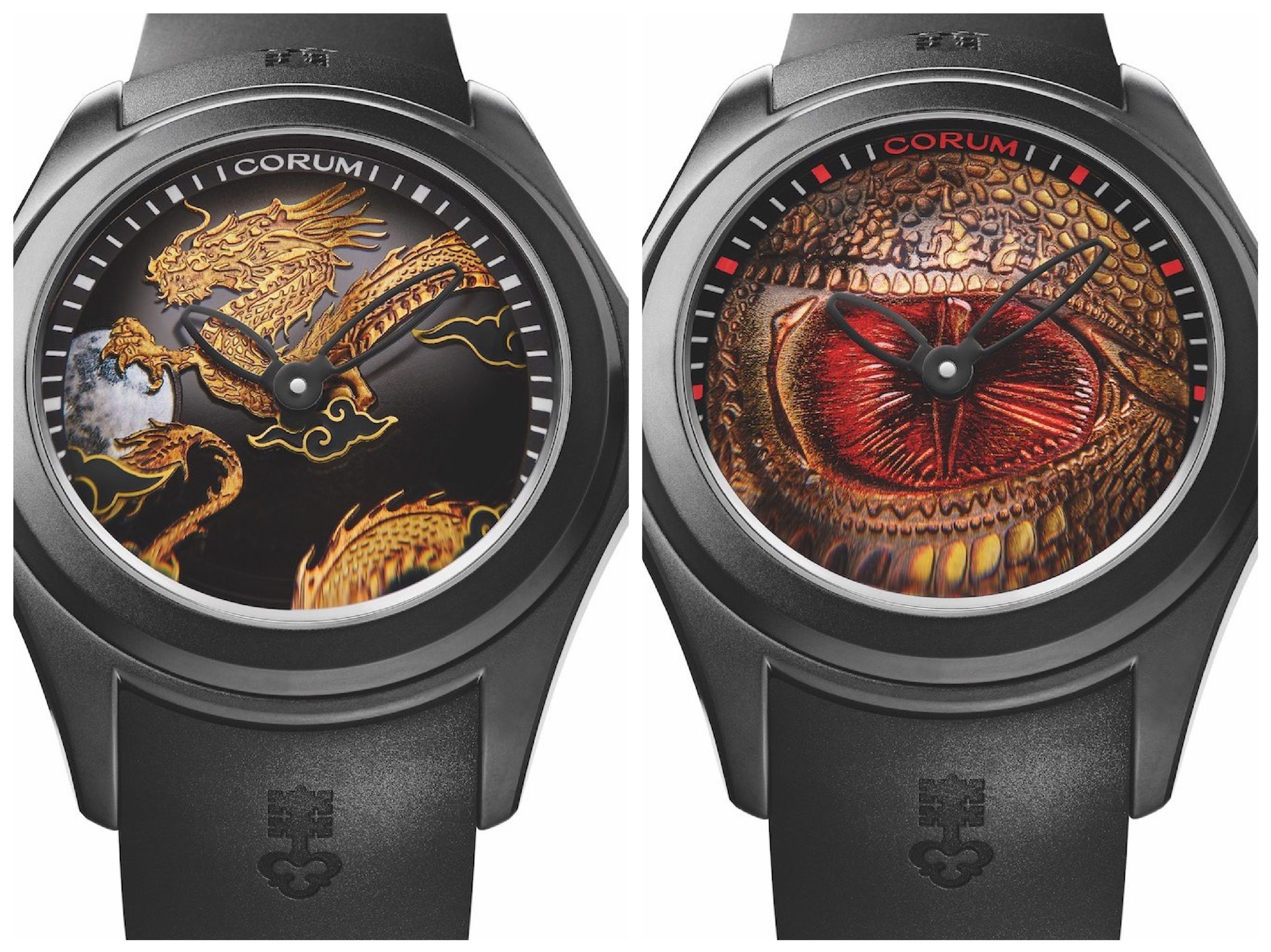 Oggi torna in pole position con un’interpretazione molto originale del Dragone che sembra sollevarsi con le sue scaglie dorate sul quadrante dove la notte, compresa una luna in madreperla, sta coprendo con le sue nuvole il tramonto all’orizzonte. Nella seconda versione, molto più d’impatto, il drago si snoda intorno a un occhio (il centro del mondo?) su sfondo roso e oro, Le scaglie sono meticolosamente realizzate una ad una dando vita e movimento all’intera figura.