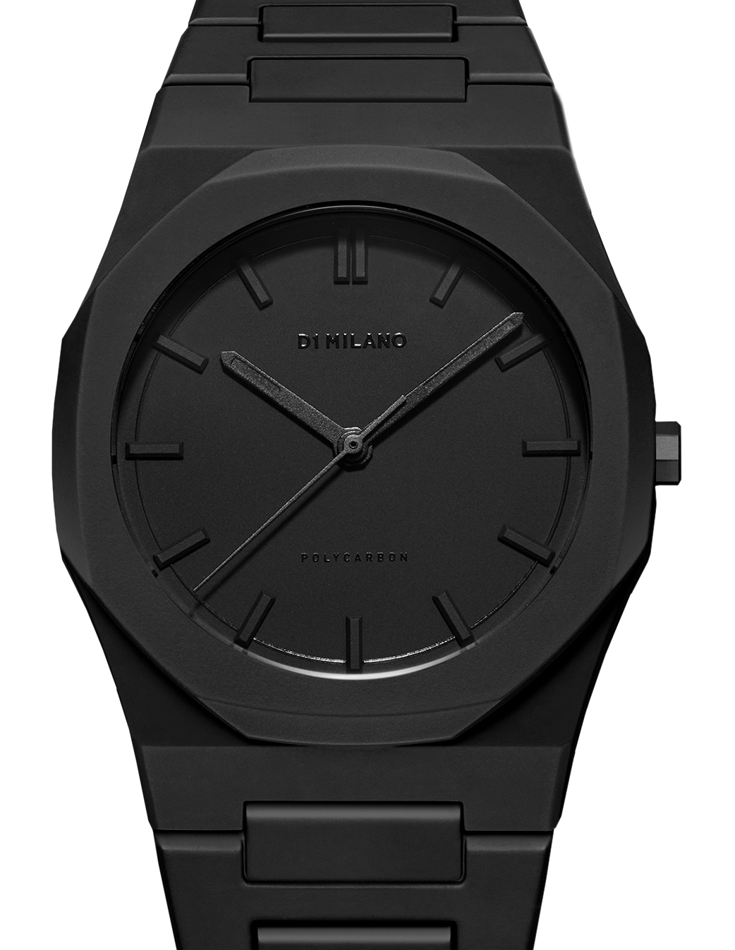 Il modello Polycarbon ø 40.5 mm, solo tempo, si chiama Shadow, ma secondo noi è più un total black; è un best seller fra gli orologi con cassa in policarbonato, molto leggero e piacevole al tatto. In gennaio sono state presentate novità nei Poly Street e nei Polychrono (tre sfere e cronografi), cromaticamente primaverili con casse e bracciali in colori pastello e lunette bianche, verde mare o asfalto e lunette a contrasto, per esempio arancio. In quanto ai prezzi, oggi, i D1 Milano sono sotto i 200 o i 500 Euro, ad eccezione dell’Automatico poco meno di 700 Euro.