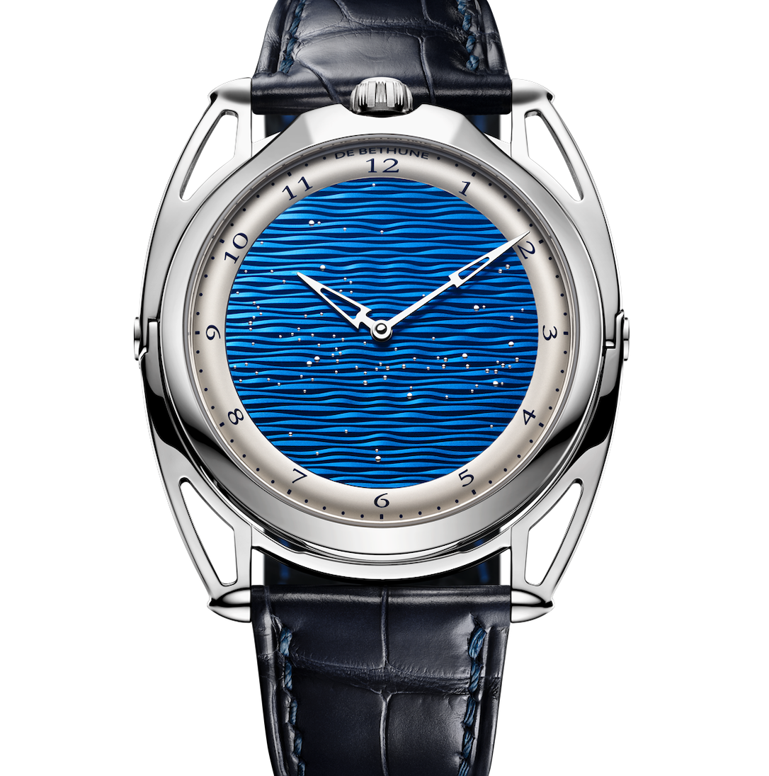 La tradizionale cassa DB è stata rimpicciolita, il suo diametro misura mm 38,7, spessore mmm 7,4 mm, w.r. a 3 ATM, con anse mobili in titanio e fondo in vero zaffiro 1800 Vickers. Il movimento è il Calibro DB 2005 a carica manuale (27 rubini, 28.800 A/h, riserva di carica 6 gg grazie al doppio bariletto autoregolatore, bilanciere in titanio con inserti in oro bianco, spirale De Bethune, ruota scappamento in silicio) è stato adattato al nuovo spazio disponibile e lo studio dei nuovi bilancieri ha portato ad un’inedita colorazione bianca, proprio come la spuma delle onde. Lancette in titanio lucido, giro ei minuti e indici in cifre arabe, stampati color argento. Cinturino in doppio alligatore, fibbia in titanio grado 5 ad ardiglione.