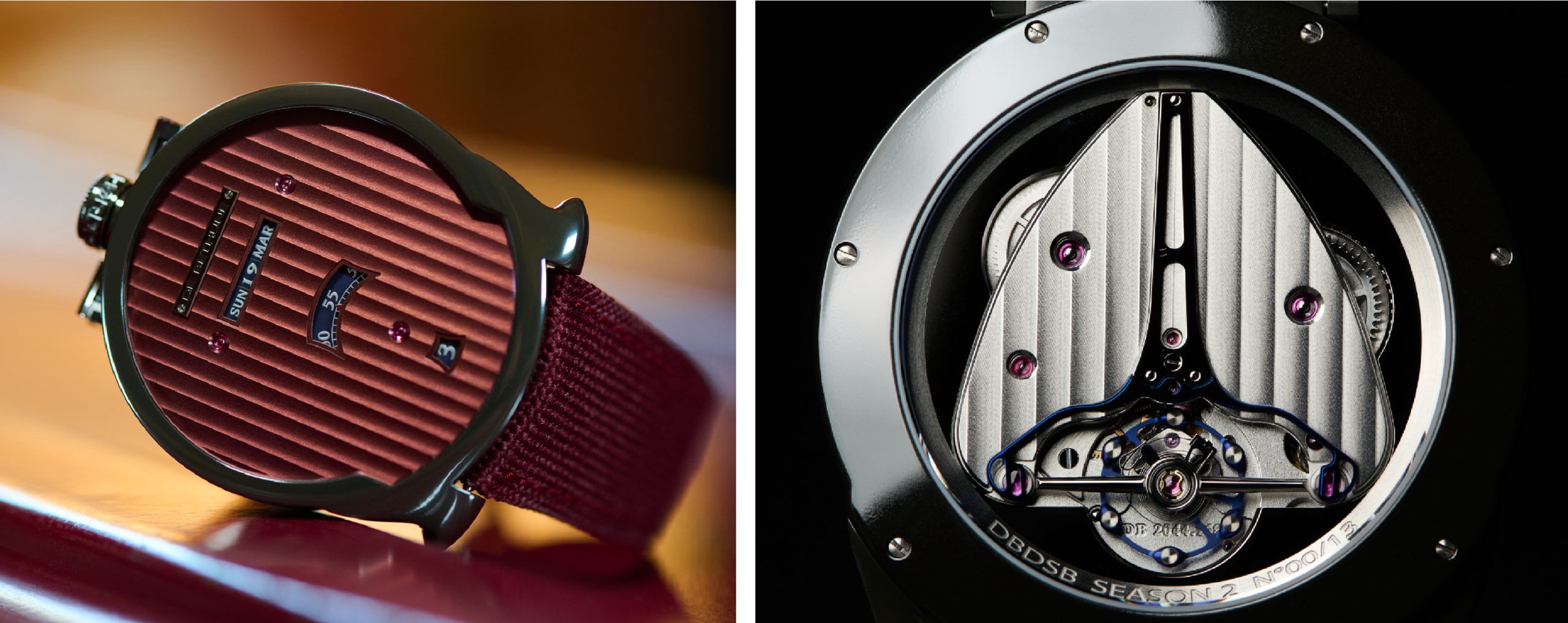 Tornando indietro negli anni ricordiamo le edizioni limitate del triplo calendario nel 2006. che, sul quadrante, aveva per la prima volta un motivo decorato a Côtes de Genève. Oggi ritroviamo questa complicazione nel DBD Season 2 realizzato in zirconio lucido antracite, cassa ø mm 42,6 con anse a ogiva e quadrante bordeaux lavorato con lo stesso motivo. Cinque dischi indicano giorno, data e mese mentre nella parte inferiore del quadrante su due finestrelle si vedono le ore saltanti e i minuti. Dal fondo in vetro zaffiro si può ammirare il Calibro meccanico a carica manuale DB2044, A/h 28’800, bilanciere in titanio con inserto in oro bianco (presentato nel 2016 come la spirale con la parte terminale piatta) triplo sistema di protezione pare-chute (ideato nel 2005), 29 rubini, riserva di carica 5 gg, ruota scappamento in silicio. Entrambi i vetri zaffiro durezza 1800 Vickers hanno un doppio trattamento antiriflesso.