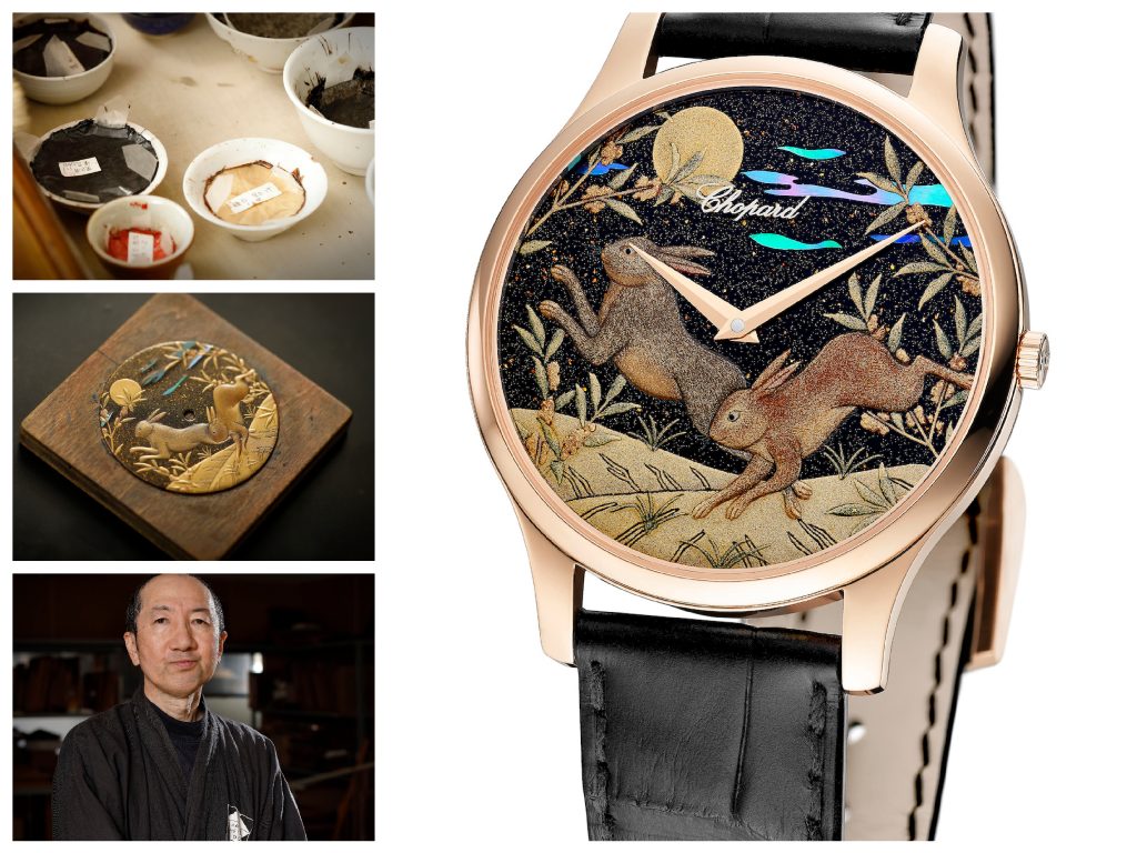 Molto più complessa la proposta maschile, scelta da Friedrich Scheufele, Co-Presidente della Maison; anche questo orologio è realizzato in 88 esemplari. La cassa del L.U.C.XP, ø 39,5 in oro etico satinato e lucido, accoglie il movimento di Manifattura Calibro L.U.C 96.17-L automatico ultrapiatto con microrotore (la massa oscillante decentrata è in oro e, caricando i due bariletti, assicura 65 ore di riserva di carica). Lo spessore dell’orologio completo è di mm 6,80, il fondo è a vista, la corona in oro rosa etico mostra il logo L.U.C. ma è il quadrante ad attirare l’attenzione per la lavorazione in lacca Urushi con polvere d’oro e incrostazioni di madreperla. È realizzato in Giappone nella secolare azienda Yamada Heiando, dal maestro laccatore Minori Koizumi (nella foto) che, seguendo la tecnica Maki-e, tra gli strati della lacca ricavata dalla linfa dell’albero Toxicodendron vernicifluum, ha inserito pagliuzze d’oro per illuminare la scena dei due conigli in primo piano con la luna sullo sfondo. Questa interpretazione si lega alla cultura cinese secondo la quale il coniglio d’Acqua abita sulla luna insieme alla bella Dea Chang’e e rappresenta prudenza e agilità, ma come simbolo dello zodiaco è presagio di longevità, pace e prosperità; i due conigli uno grigio e l’altri rossiccio, saltano sotto la luna piena, circondati da ramoscelli di Osmanto, detto anche olivo del tè.