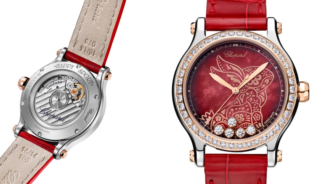 In edizione limitata a 88 esemplari con cassa ø 33 mm, in acciaio inossidabile e oro etico rosa (la corona ha un rubino cabochon), questo orologio sfoggia un quadrante in madreperla sfumata rossa con motivo a onde decalcate, sul quale si muovono I cinque tradizionali diamanti; altri diamanti sono incastonati sulla lunetta. Il coniglio dorato è raffigurato con le orecchie diritte e il muso rivolto a ore 2. Dal fondo si vede il movimento automatico di Manifattura Calibro Chopard 09.01-C, rubini 27, A/h 25.200, riserva di carica 42 h, il suo ø è di mm 20,40 e lo spessore di mm 3,65. L’orologio è completato da un cinturino rosso lucido in alligatore con fibbia in acciaio inossidabile.