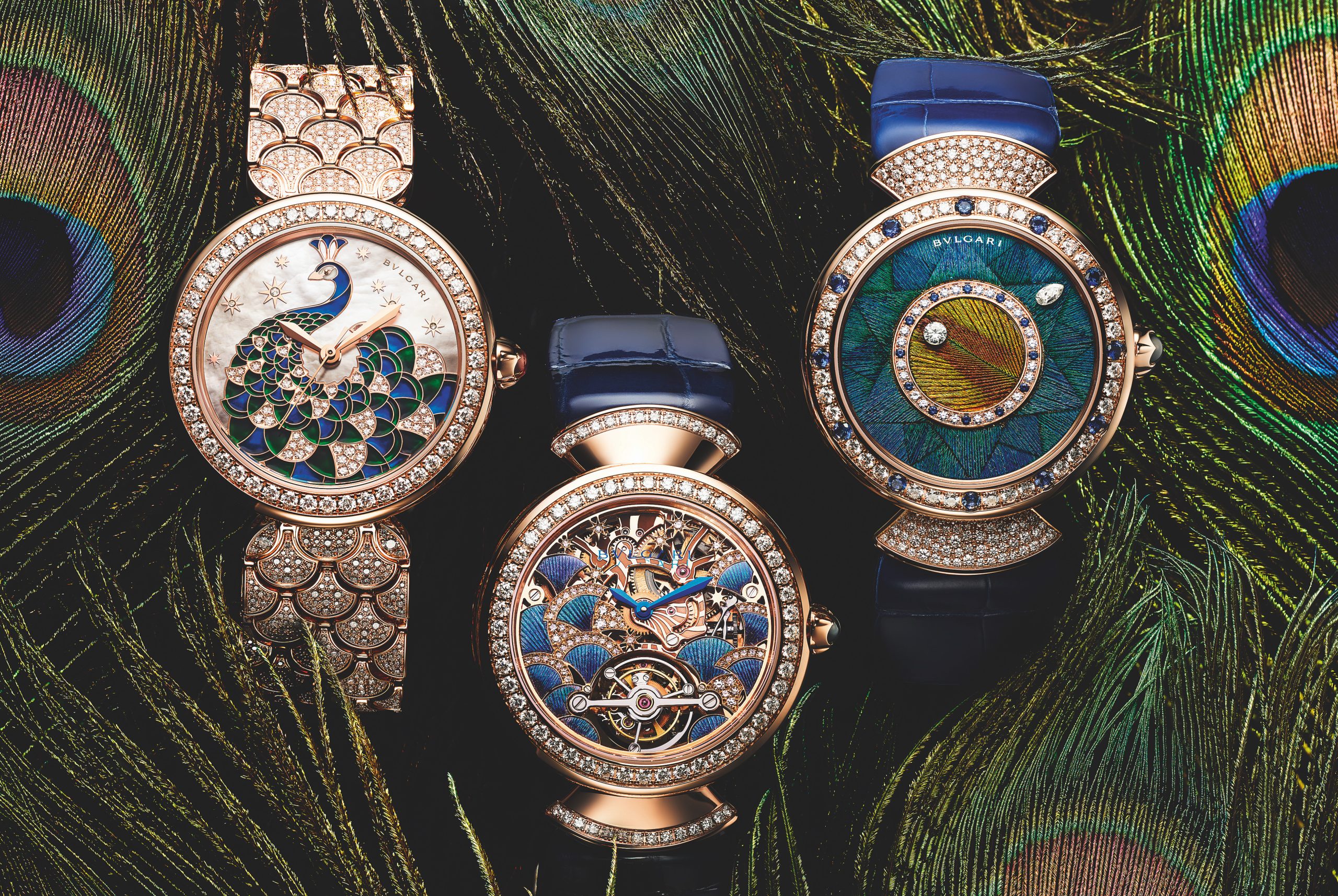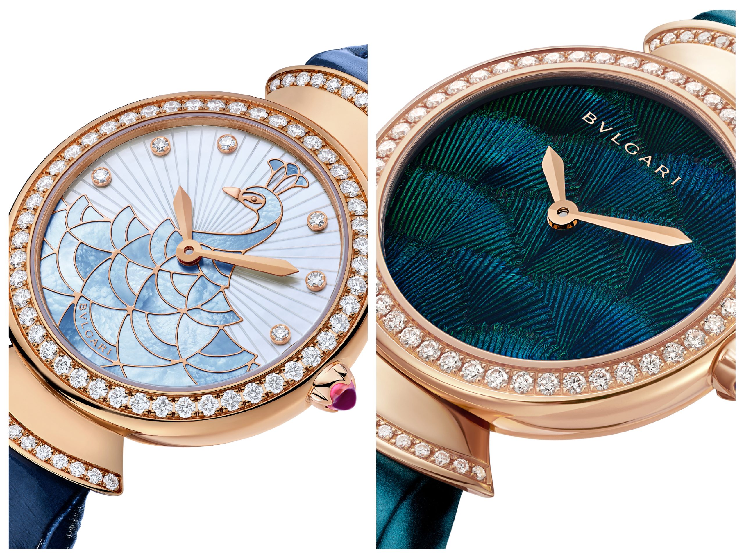 Di queste cinque nuove versioni tre, con cassa in oro rosa ø 37 mm, sono equipaggiate con movimenti meccanici automatici di Manifattura; il Divas’ Dream Peacock Precious Marquetry ha il quadrante in oro rosa incastonato con diamanti e intarsi di avventurina e malachite, ispirati dai mosaici delle Terme di Caracalla a Roma, il movimento complicato è il Calibro BVL 262 automatico con ore saltanti e minuti retrogradi. Il Divas’ Dream Peacock Dischi indica ore e minuti con due diamanti (uno tondo e uno a pera) su dischi concentrici, il movimento automatico è il Calibro BVL308; il cinturino in alligatore blu è coordinato ai colori delle vere piume di pavone impiegate quadrante. Infine nel Divas’Dream Peacock Diamonds, con preziosissimo bracciale e movimento automatico Bol 191, il quadrante in madreperla bianca è un quadro dove il pavone, dipinto a mano con 14 colori diversi, spicca su un fondo di brillanti; in totale sono oltre 1450 le pietre preziose impiegate; per tutti la corona è in oro rosa con cabochon e le anse sono a ventaglio. Le ultime due invece: Divas’ Dream Peacock Feather Marquetry e Divas’ Dream Peacock Mother-of-Pearl Marquetry. hanno la cassa ø 33 mm e movimento al quarzo. Sul quadrante del primo le piume che il pavone perde naturalmente e che raccolte e conservate, sono poi state impiegate su questo orologio, sull’esemplare in madreperla Marquetry inserti in madreperla colorata disegnano un pavone.