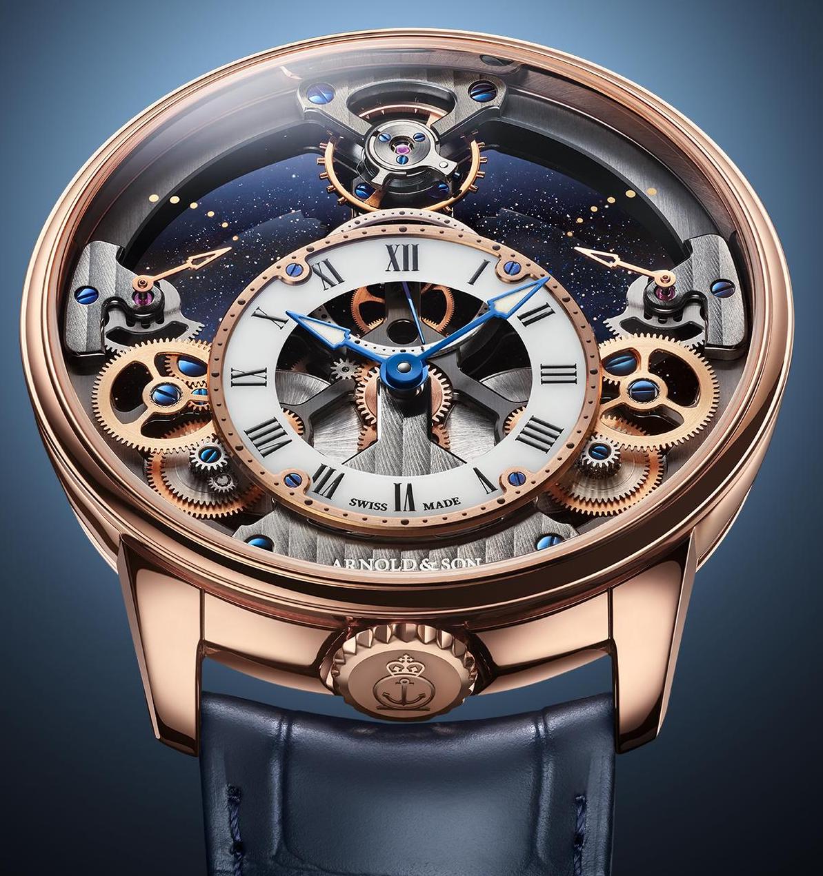 ARNOLD & SON: Pyramid Time o la Verticale del Tempo ha la cassa ø 42,5 mm, spessore mm 10,5, in oro rosso o platino completamente ridisegnata, con fondo in vetro avventurina e cerchio dei minuti in opale bianco circondato da oro o platino. L’architettura del movimento riprende quella degli orologi del primo Ottocento con gli organi del movimento dall’alto verso il basso e in particolare da un disegno di mr Arnold. Sul quadrante due indicatori simmetrici della riserva di carica (90 h)mostrano l’andamento dei due bariletti che alimentano il Calibro A&S1615 a carica manuale, 27 rubini, 21.600 A/h, sviluppato, assemblato e regolato in house.