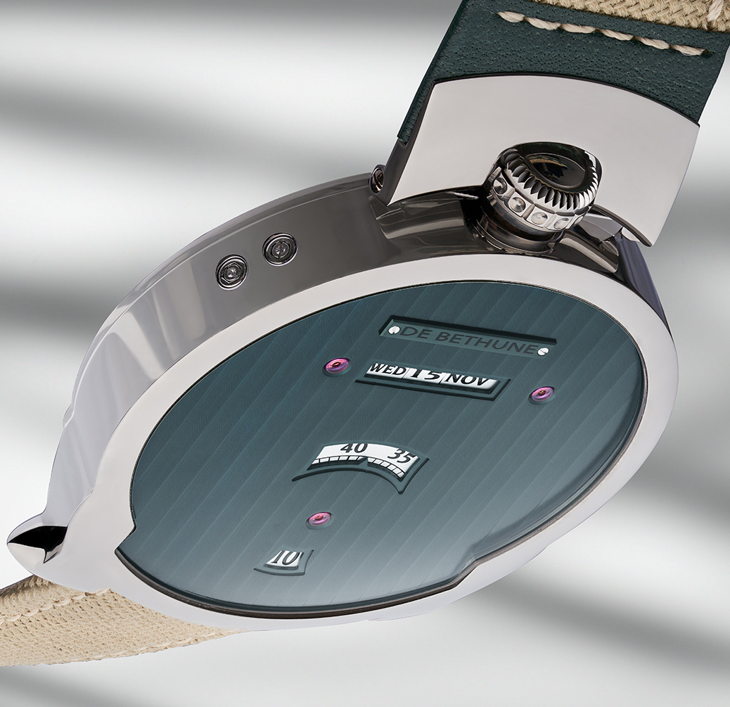 DE BETHUNE ha presentato il suo DBD Evergreen con cassa in titano grado 5 ø 42,6, spessore mm 9,4 e quadrante verde, un colore scelto da molti. Movimento Calibro DB 2044 a carica manuale, coperto dai molti brevetti ottenuti dalla Maison; A/h 28.800, rubini 29 e, grazie al doppio bariletto, riserva di carica 5 gg,