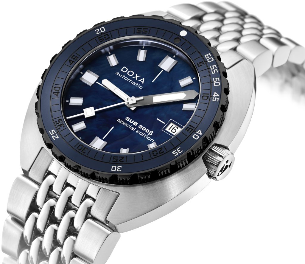 DOXA che a Ginevra in Settembre aveva svelato il suo Diver 300, per festeggiare la sua lunga collabrorazione con il gioielliere Seddiqi sui mercati mediorientali, ha presentato un’edizione limitata a 50 esemplari del Diver nel quale il quadrante è in madreperla naturale blu profondo; inoltre cassa e profilo sono stati leggermente modificati (11,95 mm invece dei 13,65 mm del SUB 300T), anche lo spessore della lunetta è stato ridotto di 0,5 mm.