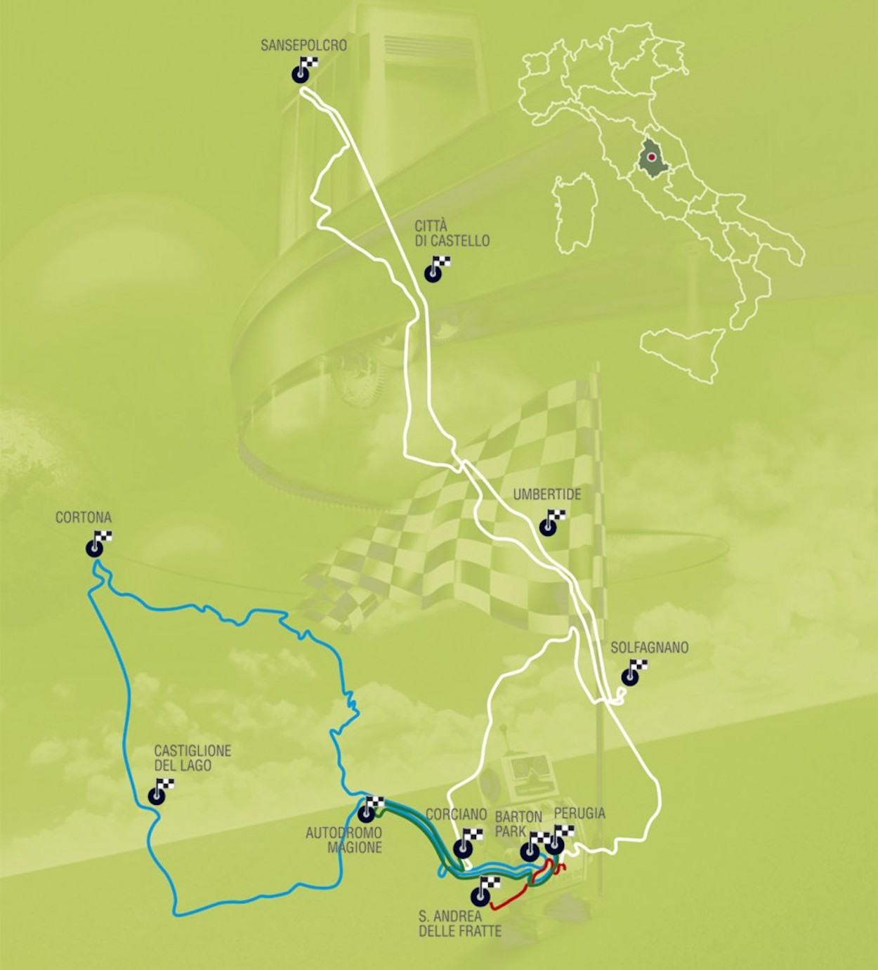 Questo il programma delle giornate umbre. Giovedì, dopo la punzonatura, le vetture disputeranno la prima delle previste prove di abilità, a Magione nell’Autodromo. Venerdì partenza alle 8.30: ore 9:15 Tenuta Lamborghini (Prova 2); ore 11:30 Visita di Cortona, ore 13:30 Pranzo, ore 16:45 Quasar Village (Prova 3); ore 18:00 Aperitivo al Barton Park, ore 20:00 Cena a Solomeo da Brunello Cucinelli. Sabato partenza ore 8.30; ore 10:00 Castello di Solfagnano (Prova 4); ore 11:00 Visita della città di Sansepolcro; ore 13:30 Pranzo; ore 17:30 trasferimento a Perugia; ore 18:00 Passerella delle auto in Corso Vannucci; ore 19:00 Arrivo in hotel; ore 21:00 Cena di gala al Castello di Rosciano. Domenica ore 9:30 Nestlè Perugina: rievocazione storica Coppa della Perugina; ore 11:00 Mostra statica delle auto a San Francesco al Prato, Perugia; ore 12:00 Premiazioni; ore 13:00 Pranzo all’Accademia Belle Arti.