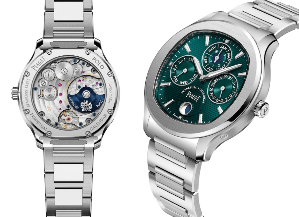 Che Piaget, dal 1960, sia maestra nel realizzare movimenti sottilii, è noto, ma alla Côte-aux-Fées. e a Ginevra, i confini dell’abilità dei suoi addetti, si sono spesso tramutati da traguardi in base di partenza. Come potrebbe accadere per questo Polo che per la prima volta accoglie il nuovo calibro ultrasottile 1255P spessore 4 mm (derivato dal Calibro 1200P) completato dalla funzione del Calendario Perpetuo con fasi di luna. Lo spessore totale del nuovo orologio è di mm 8,65.