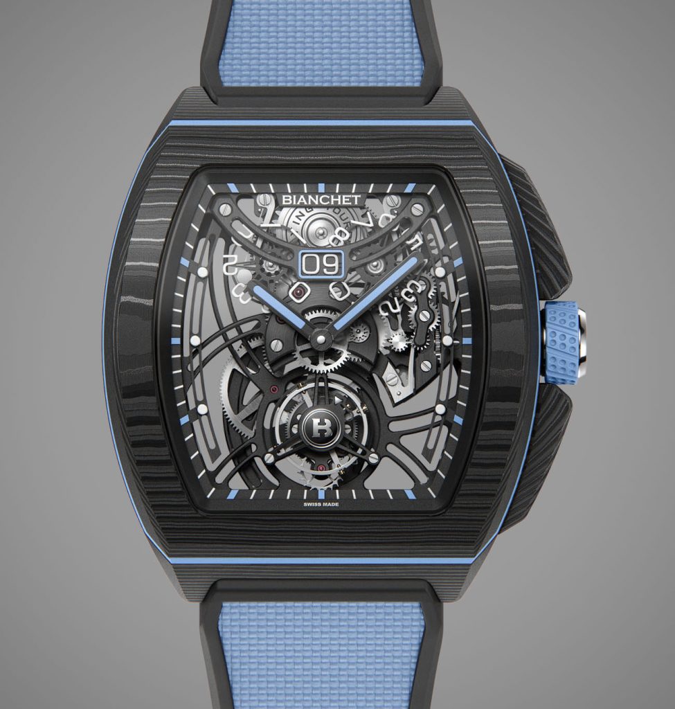Flying Tourbillon Grande Date squelette unweiled by the Brand founded by Rodolfo andE+ Emanuelle Testa Bianchet, with soft colors.