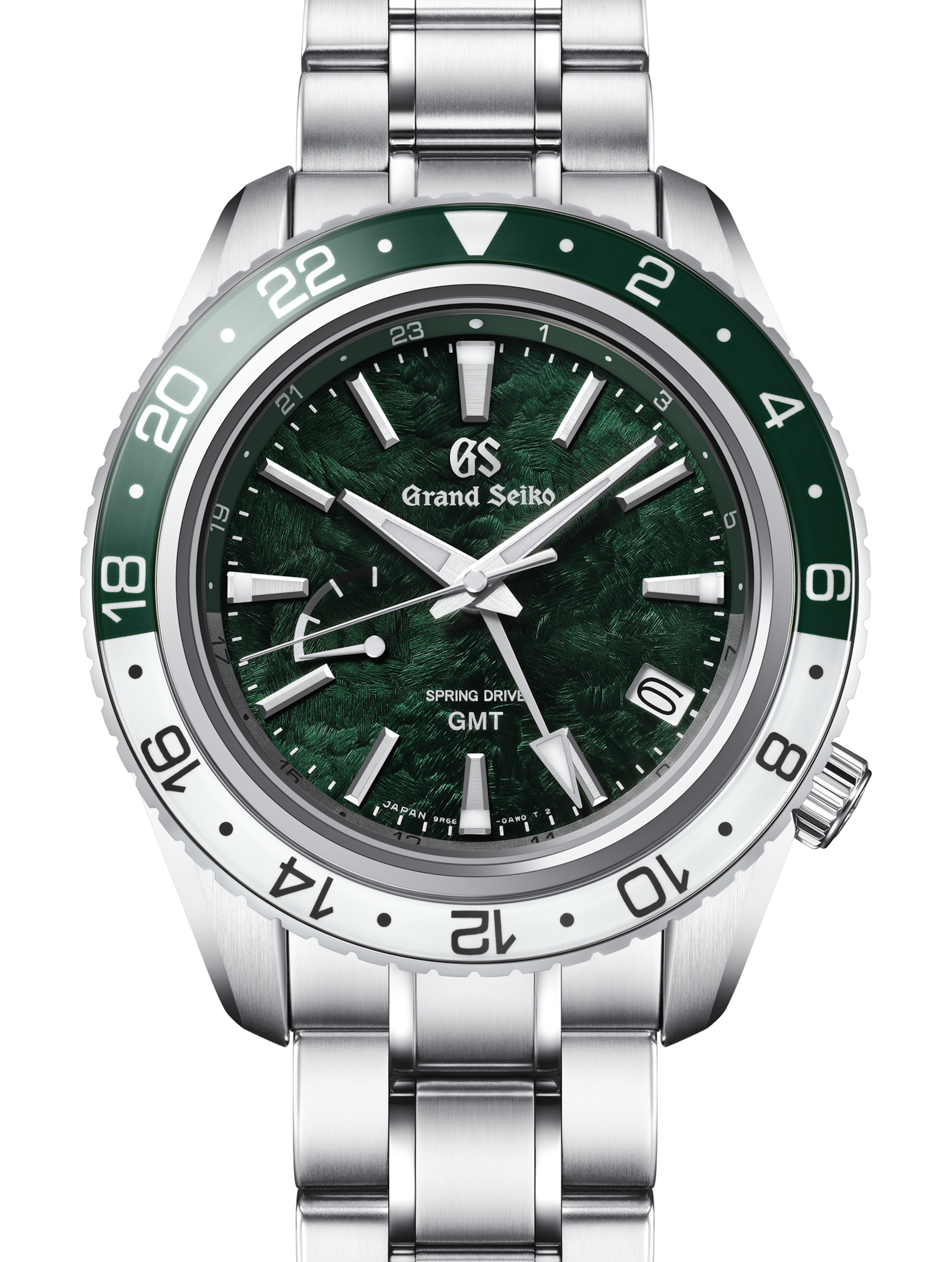 Illazioni maliziose a parte, ecco i risultati delle lavorazioni eseguite dallo Shinsu Watchn Studio, al quale è demandata la creatività dei G.S. Spring Drive che, dalla montagne intorno a Shiojiri, trova fonti di ispirazione da trasferire cromaticamente su quadranti e lunette. Come nel caso della Ref. SBGE295, un GMT Triple Zone Time, che ricorda il verde dei boschi del monte Hotaka. La cassa in acciaio, ø 44 mm w.r. a 20 Bar, fondello trasparente, è completata dalla lunetta girevole bidirezionale. Il movimento è il Calibro automatico 9R66, carica 72 h, precisione +-15 secondi al mese.