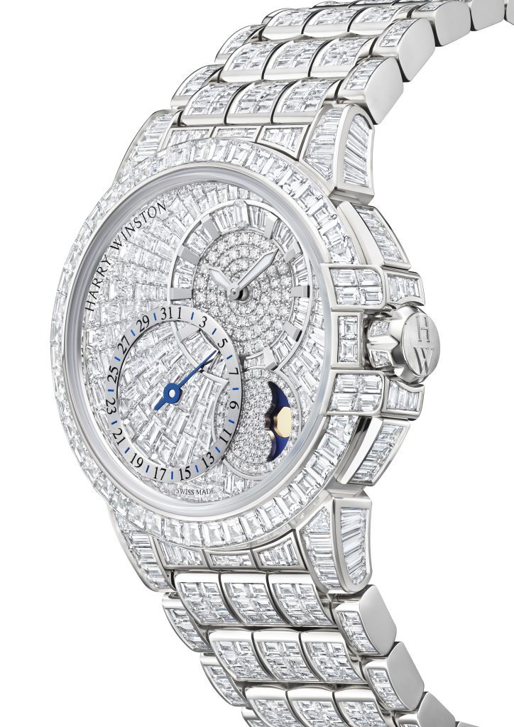 Infine come degna conclusione per un anniversario importante per un Marchio come Harry Winston, da sempre indicato come il Re dei Diamanti, pubblichiamo il Date Moon 42 mm in oro bianco, versione d’alta gioielleria; incastona infatti diamanti per oltre 40 carati e vale la pena di ammirare soprattutto il quadrante dove la decorazione a soleil e fatta con le pietre preziose.
