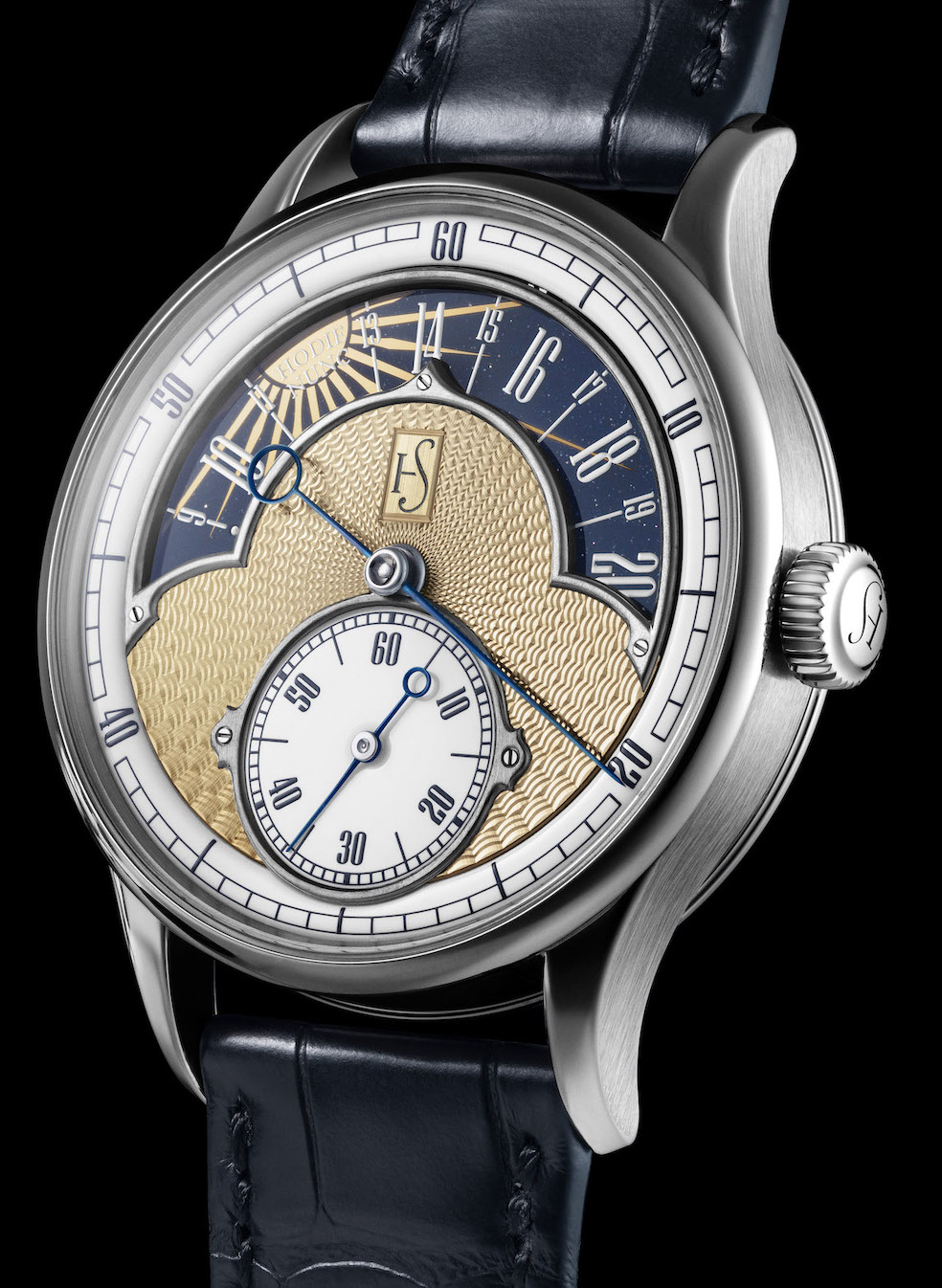 Ma è il quadrante ad attirare l’attenzione ed è qui che appare la ricerca filosofica del suo ideatore. La parte centrale è in alpacca lavorata a guillochage con il logo HS, la lancetta del regolatore che indica i minuti è in acciaio temprato e lavorato, come un tempo, alla fiamma, il quadrante dei secondi è in smalto Grande Feu, sul disco delle 24 ore in avventurina il sole metallizzato è dorato e la luna argentata, su queste due figure iscrizioni filosofiche latine nascoste, sul primo “Hodie” e “Nunc”, sulla seconda “Amor” e “Gratia”; in ogni componente si nota la ricerca della perfezione tecnica ed estetica. Sull’Essentiel sono applicate anche tre piccole placche sulle quali si leggono queste incisioni: Tree Of Life, L’Essentiel e Creare Durare.
