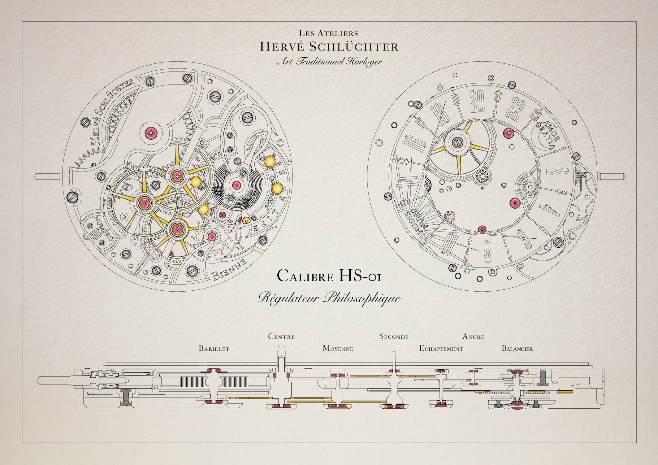 Per il suo primo calibro Mr Hervé ha voluto far rivivere alcune tradizioni del passato, per esempio un bilanciere dalle proporzioni identiche a quelle dei bilancieri impiegati negli orologi da tasca prodotti nell’età d’oro dell’orologeria, un’ancora svizzera “moustache”, ruote grandi, componenti lucidati a specchio. Le complicazioni sono due, il disco delle 24 ore e lo stop secondi, tre invece i componenti che rimandano al passato, l’ancora svizzera equilibrata con i baffi, il cricchetto e la corona a denti di lupo e il bilanciere Guillaume.