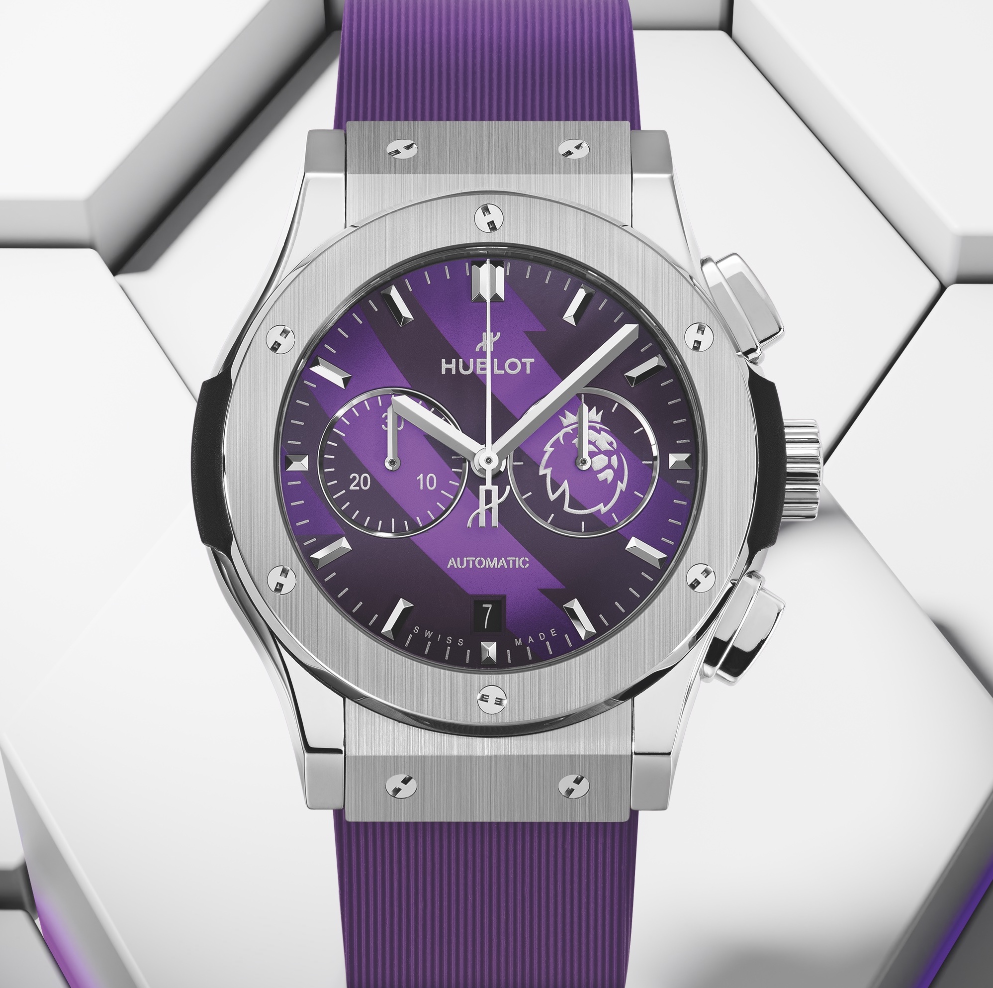 Per la Premier League Hublot, che sin dal 2006 è vicino ai grandi eventi calcistici (e della Premier League è cronometrista ufficiale dal 2020) ha realizzato, in tiratura limitata a 100 esemplari numerati un nuovo Classic Fusion Chronograph, cassa in titanio ø 42 mm con finitura lucida e satinata come la lunetta e il fondello