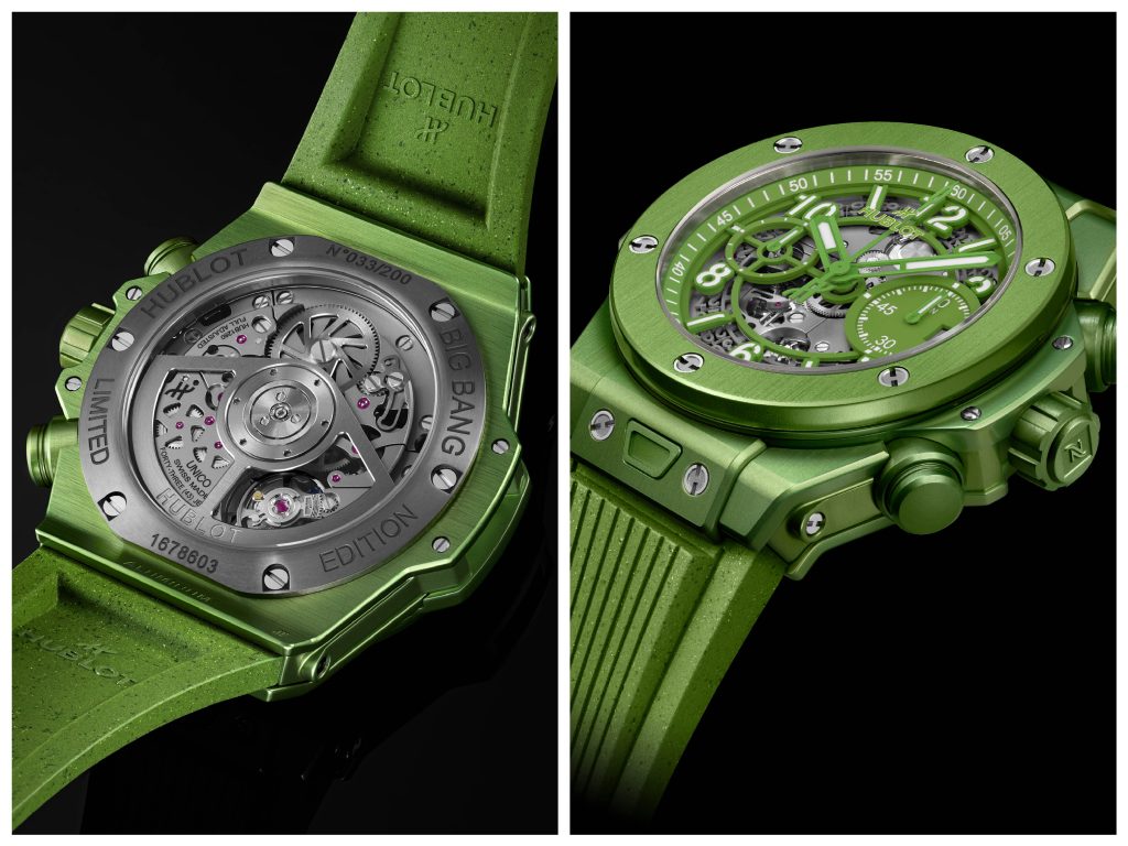 Hublot ha anche reso noto che i sette materiali che compongono il Big Bang Unico, compreso il cinturino, hanno comportato lunghi studi e test per arrivare all’uniformità cromatica tra l’alluminio anodizzato, lo smalto del quadrante e delle lancette, la decalcomania del logo Hublot sul vetro, il caucciù strutturato a righe e il tessuto del cinturino con chiusura in velcro. Identica cura anche per la confezione Greenbox, che sarà impiegata per tutta la nuova produzione. Realizzata in legno massello di quercia e con cerniere dalla provenienza tracciabile di filiere corte, potrà essere riutilizzata; il 98% delle componenti interne rimovibili è in tessuto, fili di plastica o PET riciclati eco-friedly, così come la carta e il cartone. Quella che contiene il nuovo Big Bang Unico reca sul coperchio i marchi delle due aziende coinvolte.