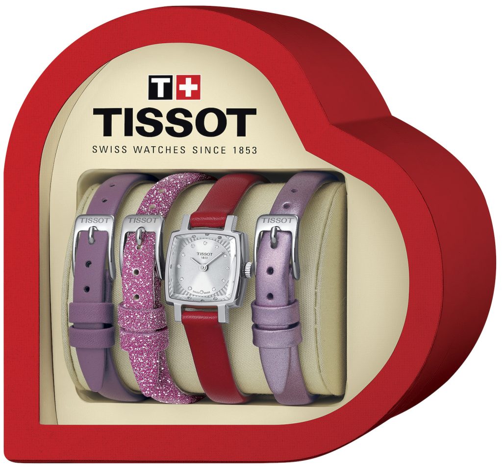 TISSOT: Intrigante la confezione a cuore, che contiene il Lovely Square con movimento svizzero al quarzo, quadrante argento con 12 indici in diamanti, corredato dal cinturino rosso a sgancio rapido e da altri tre per poterlo abbinare facilmente a qualunque abbigliamento o occasione.