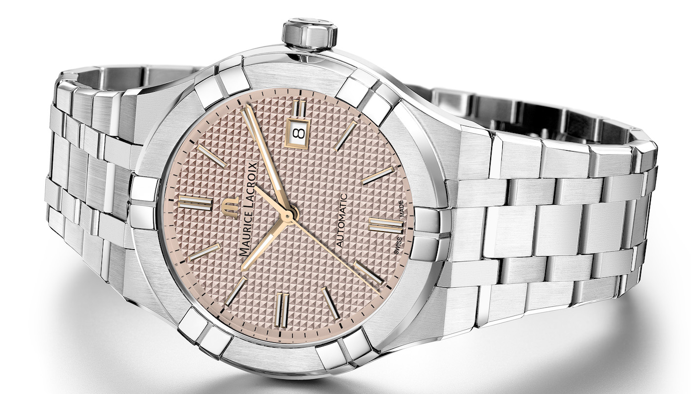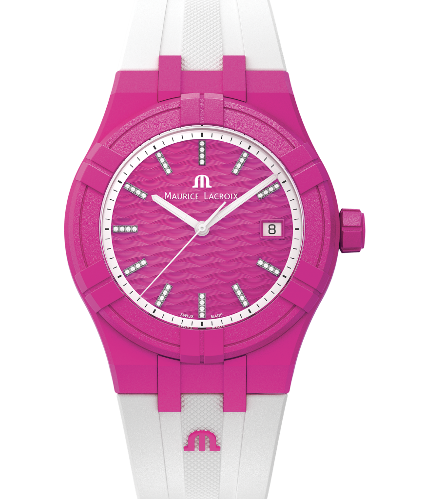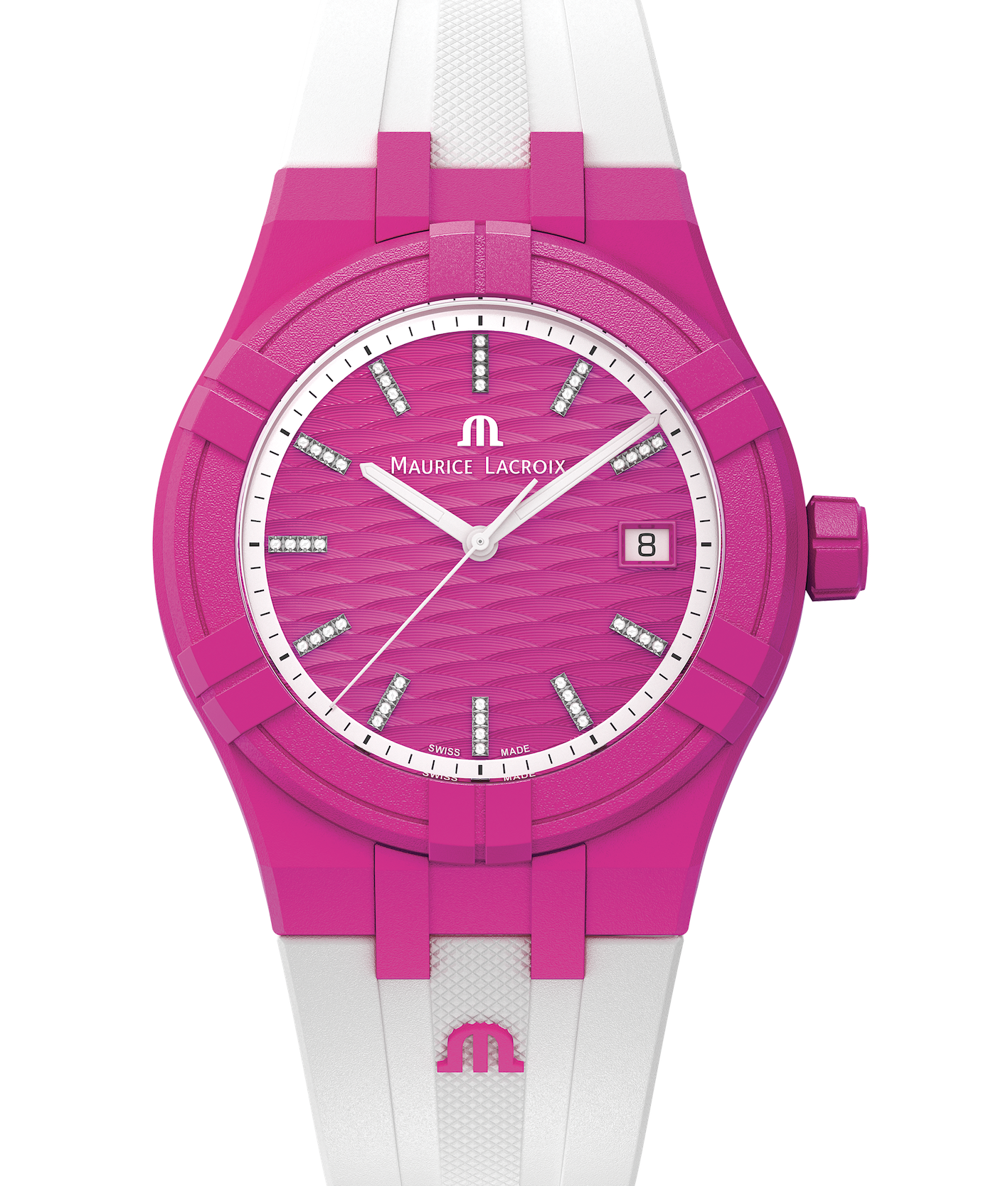 MAURICE LACROIX: Sopra, un Aikon di grande impatto e appariscente, con la cassa ø 40 mm in materiale #tide, la tecnologia che trasforma i rifiuti di plastica e che vede Maurice Lacroix in pole position per la salvaguardia degli Oceani. il cinturino è in caucciù bianco con il logo della Marca a contrasto. Color fucsia il quadrante con finitura Vague du Jura. Più tradizionale l’Aykon Quartz Ref. AI1106-PVPD2-170-1 con cassa in acciaio ø 35 mm, quadrante in madreperla bianca con incisione soleil e bracciale in acciaio o PVD oro giallo. Infine, per le più esigenti, ecco qui la versione Automatic Ref.AI6007-SS002-731-1 cassa ø 39 mm, quadrante color écru con effetto soleil e decorazione Clous de Paris, con lancette e indici luminescenti placcati oro giallo, abbinata al bracciale in acciaio o con maglie trattate PVD oro giallo.