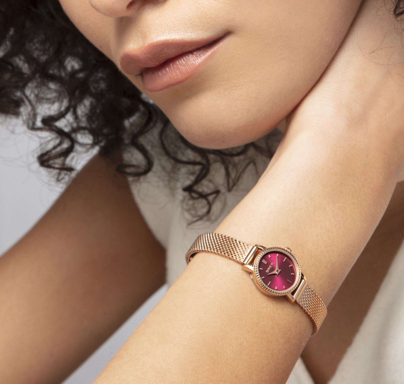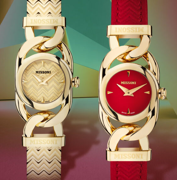 MISSONI: nella collezione Fall-Winter 2022 ha realizzato gli orologi Gioiello con cinturino coordinato al colore rosso del quadrante smaltato, disponibile anche con i tradizionali disegni a zig zag sul quadrante champagne e sul bracciale. Un’altra versione con quadrante blu ha un bracciale con grandi maglie nelle quali si intreccia un foulard di seta colorato. La cassa ø 22,8 mm è trattata IP oro color champagne o rosa, il movimento è al quarzo svizzero, bracciali e cinturino sono dotati di un sistema di sgancio rapido