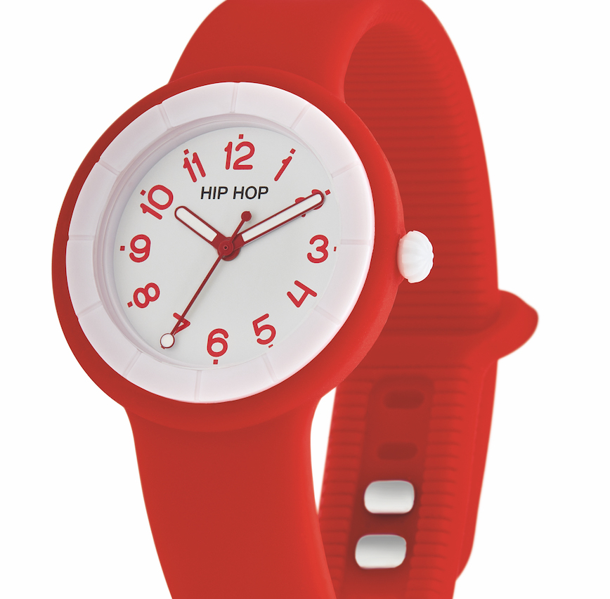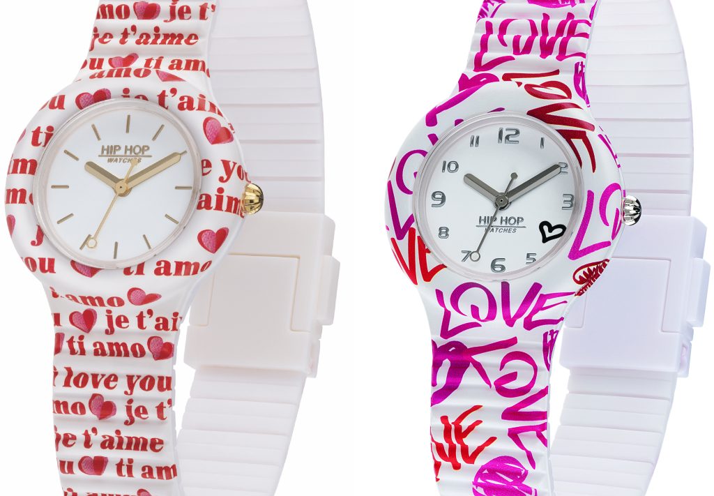 HIP HOP Oltre all’iconico Dot in rosso fiammante, nella foto a lato, con movimento al quarzo e la cassa abbinata al cinturino che si cambia a piacere anche nella collezione Heart & Love, nella foto sopra. Qui i creativi si sono sbizzarriti cercando ispirazione nell’arte Pop con casse ø 32 mm e lunette in policarbonato, cinturini in silicone bianco stampato con scritte in roso o in rosa, per dire Ti Amo in tre lingue. Nel modello a sinistra i cuori sono disegnati a mano e si alternano alle lettere in caratteri bizzarri impostati simmetricamente o secondo la fantasia del designer. Prezzo sotto i 40 Euro.