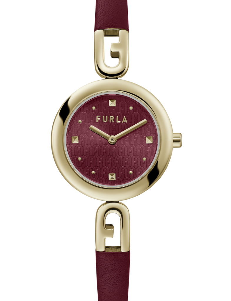 FURLA: Concludiamo con un piccolo orologio gioiello (cassa in acciaio inox ø 28 mm trattata IP color oro giallo; una versione con color oro rosa si abbina invece ad un quadrante blu. Nella collezione Bangle Leather (il bracciale Bangle infatti è rivestito con la pelle nello stesso colore del quadrante che presenta a ore 6, 9 e 12 delle borchie quadrate in rilievo, mentre le altre ore sono indicate da piccole borchie tonde. Le anse ricordano il logo ad Arco della Maison che, tono su tono, appare anche sul quadrante. La versione in blu presenta dei piccoli cristalli sulle anse e sul quadrante a ore 3, 6, 9,e 12. Movimento al quarzo giapponese. Da sottolineare che la pelle impiegata è di origine italiana ed ecofriendly, campo al quale Furla pone molta attrenzione. Prezzo poco sopra i duecento Euro.