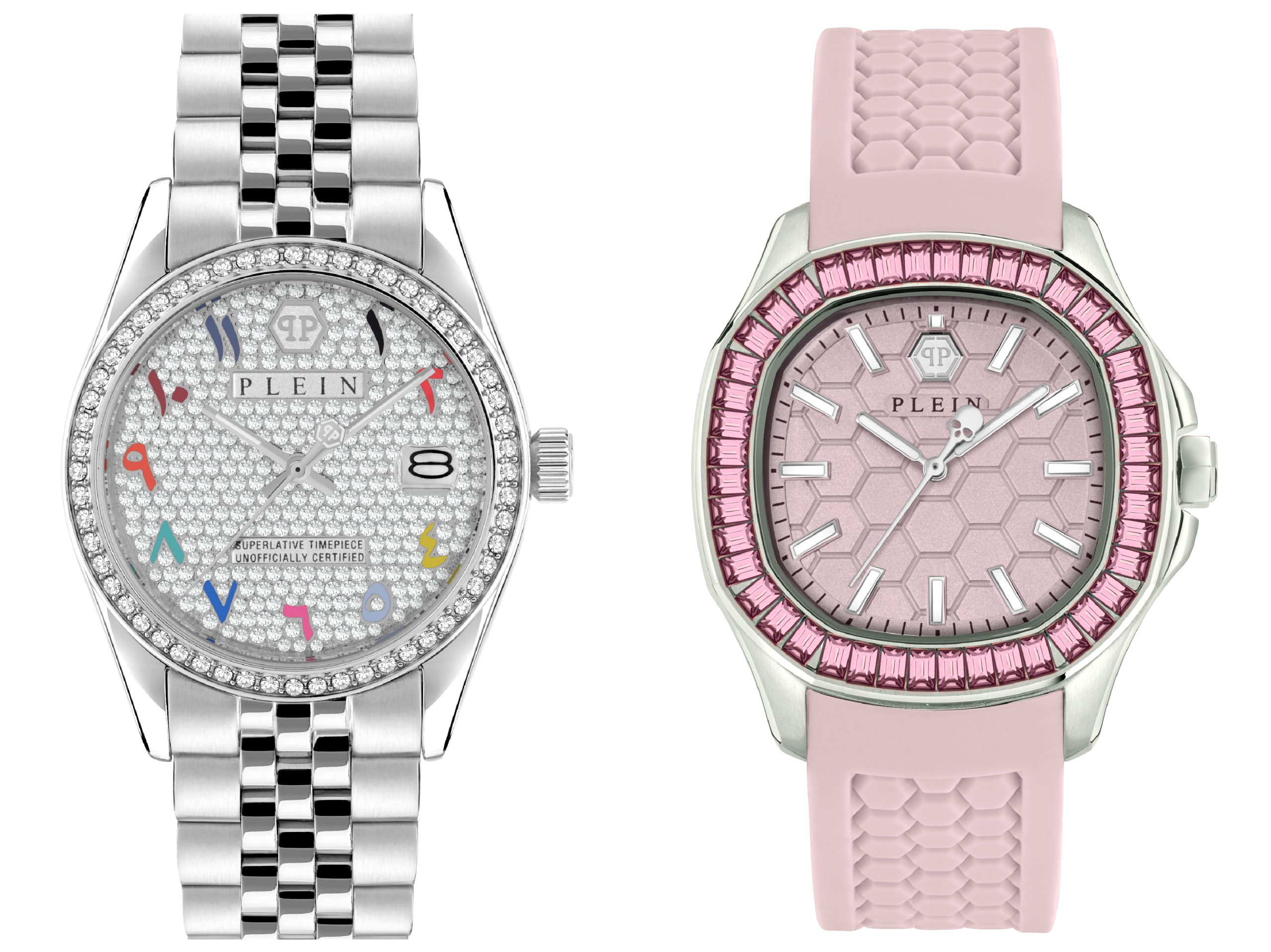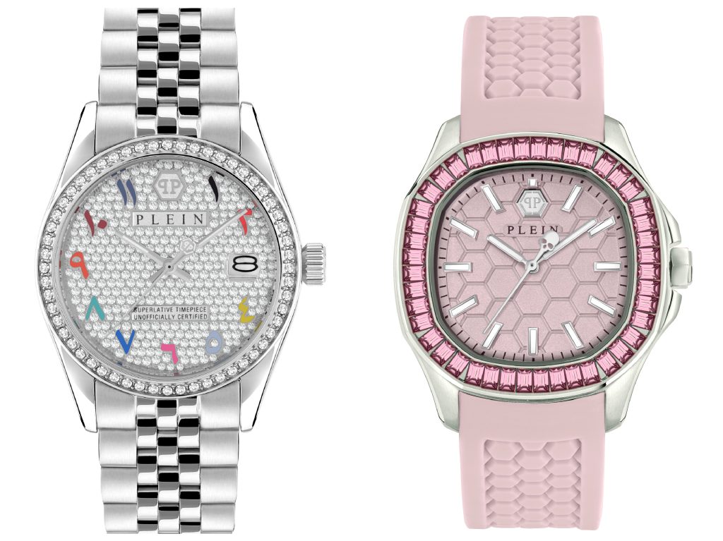 PHILIPP PLEIN: il modello a destra, cassa in acciaio ø 38 mm (anche trattata ip color oro, disponibile con altre pietre colorate e a imitazione dell’arcobaleno), quadrante con motivo esagonale ripreso nel cinturino, fa parte della collezione primavera-estate 2023; il movimento dello Spectre Lady è un Miyota Cal.2036. Più intrigante quello a sinistra, Date Superlative, per la scelta degli indici in pietre colorate su un pavé di cristalli; chi ha studiato l’arabo si accorge subito questi indici sono i numeri da 1 a 11.