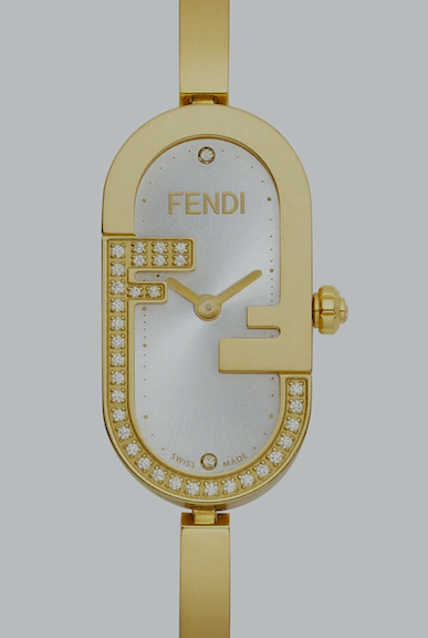 FENDI: la Marca romana ha realizzato O’Look Vertice, un segnatempo ovale la cui cassa in acciaio inossidabile trattata IP color oro lucido misura 14,80 x 21,30 mm, che suddivisa in due parti mostra il logo della Maison.