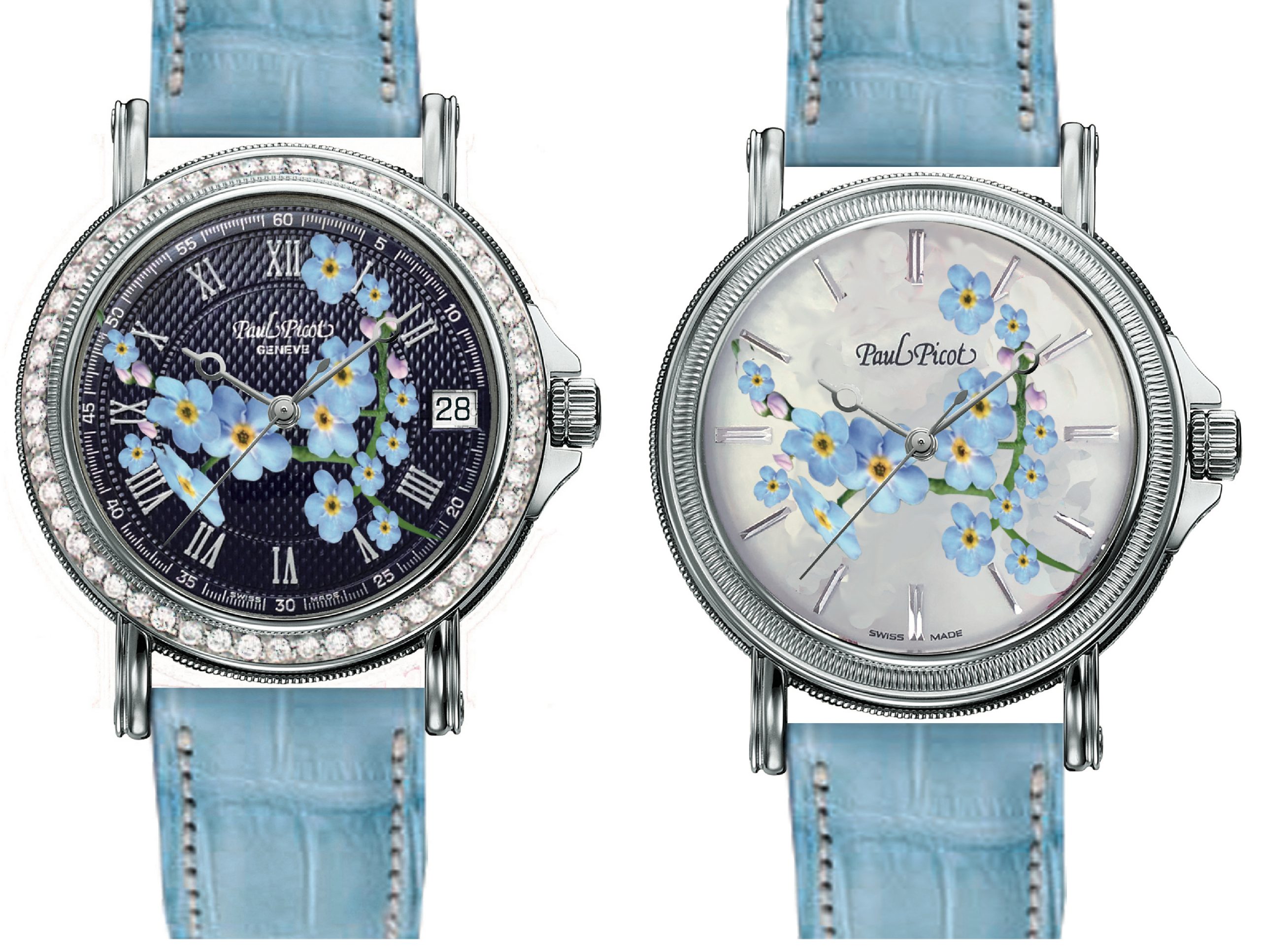 PAUL PICOT: tutti sanno che il fiore dell’amore è la rosa, ma ce n’è anche un altro, più semplice e meno appariscente, che trasmette un messaggio altrettanto importante: “non ti scordar di me”. Nella collezione Atelier c’è una novità. Sui quadranti in madreperla o in metallo lavorato a guillochage di orologi in acciaio o in oro (ø mm 31, 33 o 37) sono dipinti in miniatura i “Don’t Forget Me” (che in epoca vittoriana erano il simbolo di un amore eterno). Il movimento è il Calibro automatico PP 1700 su base eta 2892, con finiture adeguate, il cinturino in coccodrillo Louisiana celeste e cucito in tinta e la fibbia ad ardiglione è personalizzata. Un depliant con le fasi della lavorazione li accompagna insieme alla garanzia di due anni.