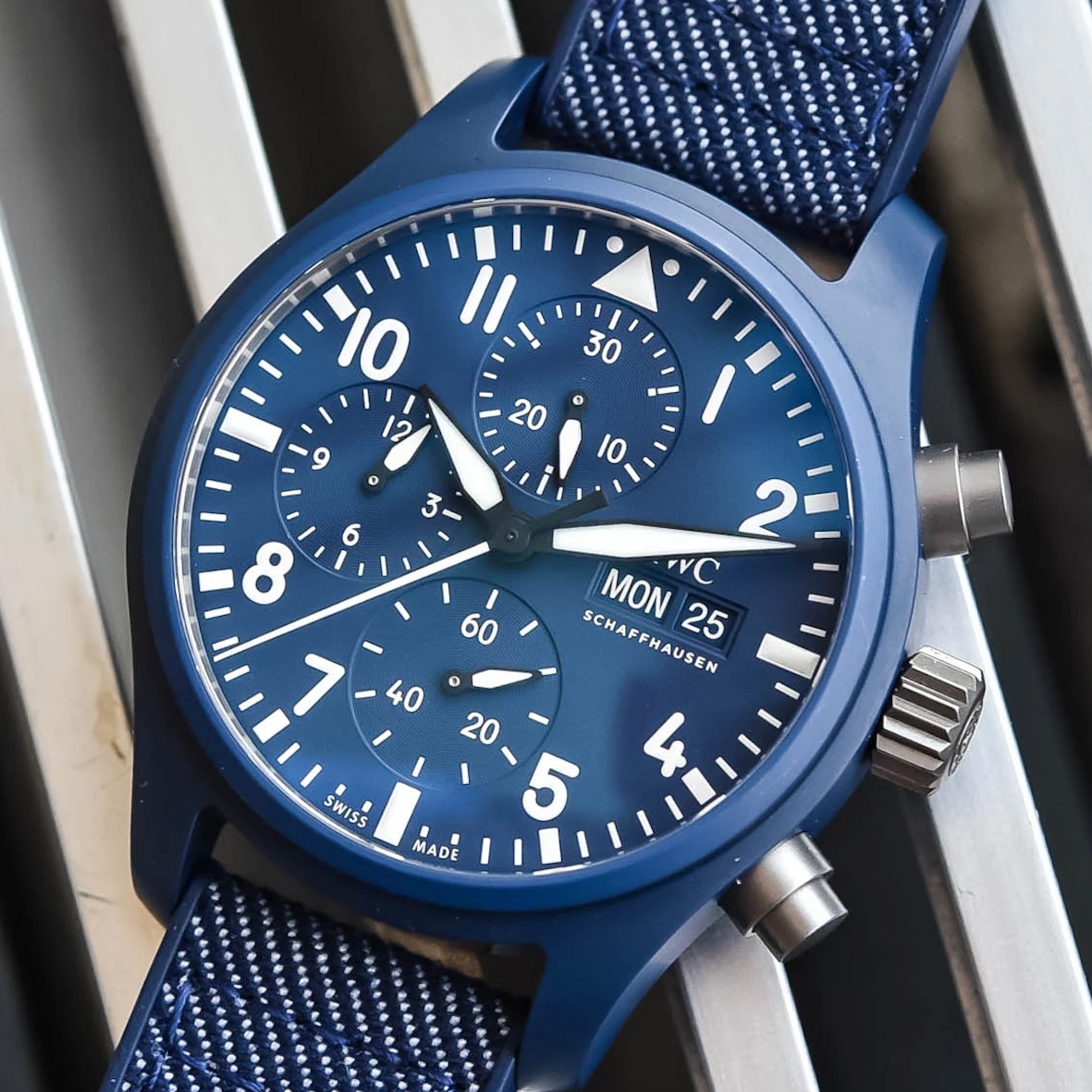 Altra novità cromatica del 2023 nei Pilot’s Chronograph 41 Top Gun cronografo. Davvero molto bella la collezione Oceana con la cassa in ceramica blu o nera; il movimento è il collaudato Calibro 69380, dotato di ruota a colonne, riserva di carica 46 h. Ridotte le dimensioni della cassa da mm 44,5 a 41,9 mm, scelta seguita non solo dalla Marca di Schaffhausen. Cinturino in tessuto tecnico in coordinato al colore della cassa e del quadrante