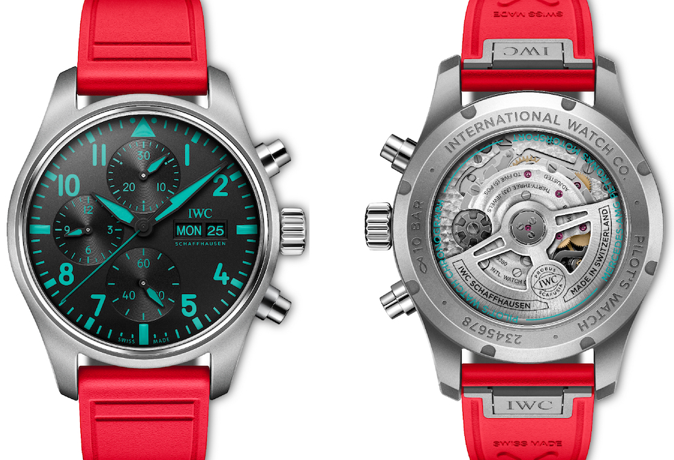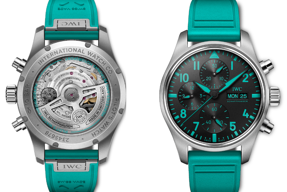 Data la partnership con il Team, ci saranno dettagli “pink” anche sull’abbigliamento di Lewis Hamilton e George Russell, mentre tutti i componenti della squadra indosseranno il nuovo cronografo con cassa in titanio grado 5, ø 41 mm (spessore mm 14,6) w.r. a 10 Bar. Sul quadrante nero indicazioni del giorno e della data, le scritte e le luminescenze di indici e lancette sono nel caratteristico verde Petronas. Il movimento automatico di Manifattura IWC calibro 69385, visibile dal fondello in vetro zaffiro, ha la cronografia con ruota a colonne, 28.800 A/h, 33 rubini, il sistema bidirezionale di carica a cricchetti accumula, nella molla, una riserva di carica di 46 ore.