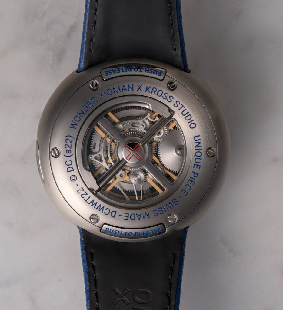 Comunque non è la prima volta che Kross Studio si avvicina al tourbillon, lo aveva già fatto con il Fior di loto realizzato in collaborazione con Alain Silberstein e visto che per la cassa di Wonder Woman, antesignano di una produzione di pezzi da collezione, non è stata data la misura, pensiamo sia come quella del Fior di Loto: 45 mm.