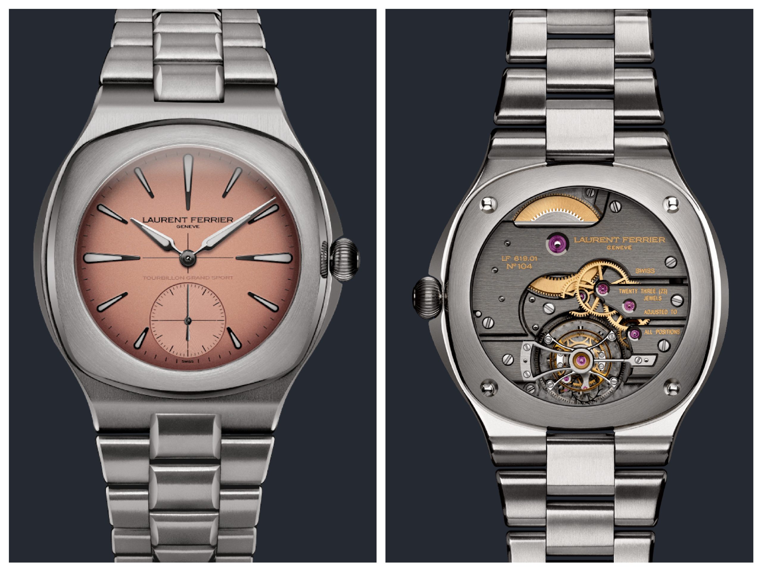Per i più questo è un color salmone, ma per chi, come Laurent Ferrier e François Servanin fondatori del Marchio, è stato un pilota nella faticosa 24 H di Le Mans, la tonalità “degradée” ricorda le prime luci dell’alba quando il cielo con l’aurora si tinge di un rosa arancione. Proprio come nella versione del Gran Sport Tourbillon Pursuit che, a differenza delle precedenti in tirature limitare, entra nel normale catalogo di produzione.