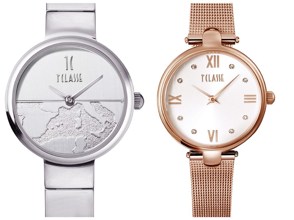 Alviero Martini Classe 1: coll. Djerba, cassa 25 mm acc o trattata IP rosa, quadranti a specchio nero o silver con la carta geografica; coll Santorini casa 32 mm quadrante silver sunray con indici in cristalli, bracciale in acciaio o in maglia milanese con finitura IP rosa. Tutti con movimenti al quarzo e sotto 140€