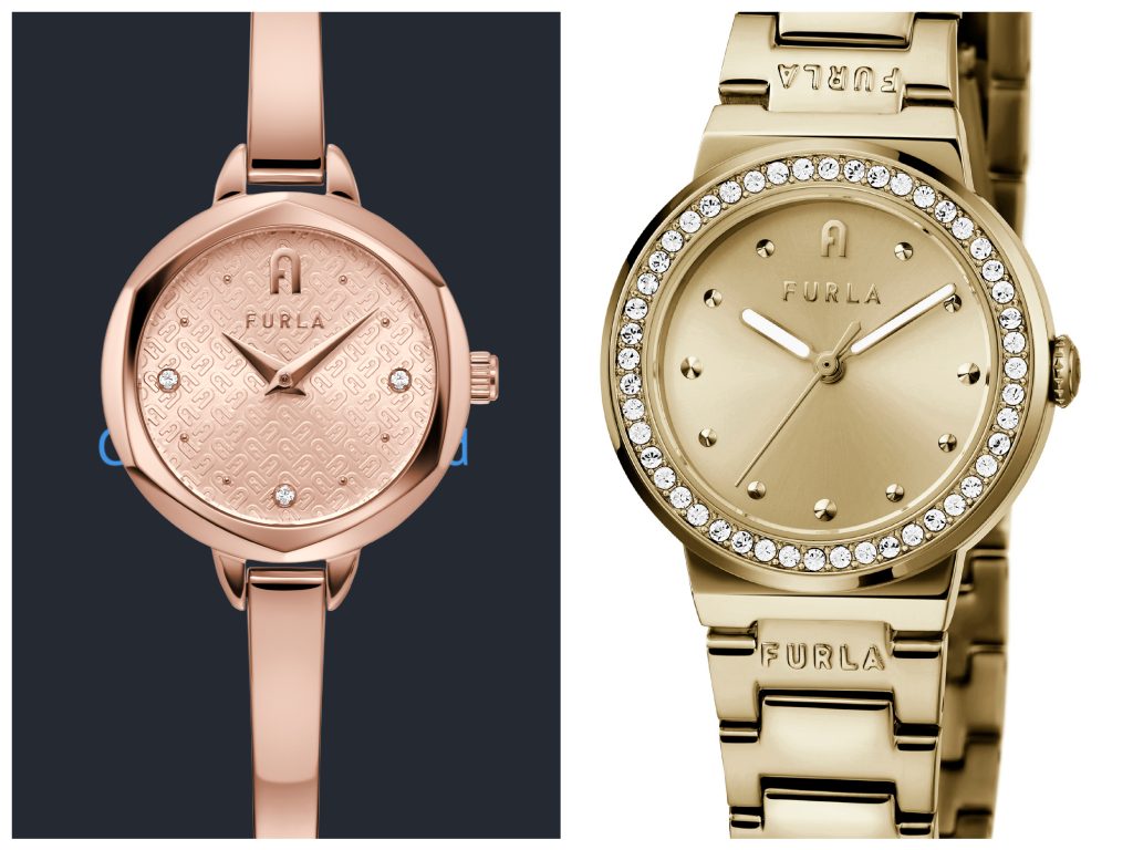 Furla: cassa mm 28 acciaio o trattata IP rosa per la coll.Arch Petite Bangle e quadrante con textura Furla Arco; coll.Tortona cassa 32 mm acciaio o trattata IP rosa e anche gold Cristal; mov.quarzo €165/209