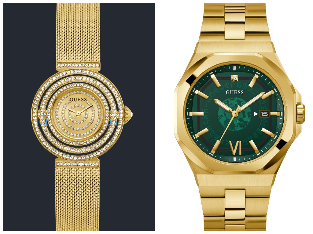 Guess. coll Dream per lei ø 36 mm acciaio o IP oro giallo con cristalli anche sul quadrante,bracc maglia milanese (€215/239); coll Emperor cassa satinata ø 42 mm acciaio, IP oro giallo o acciaio IP Black con il bracciale analogo; quadrante blu, verde o nero che mostra un movimento al quarzo (€219, 239, 249)