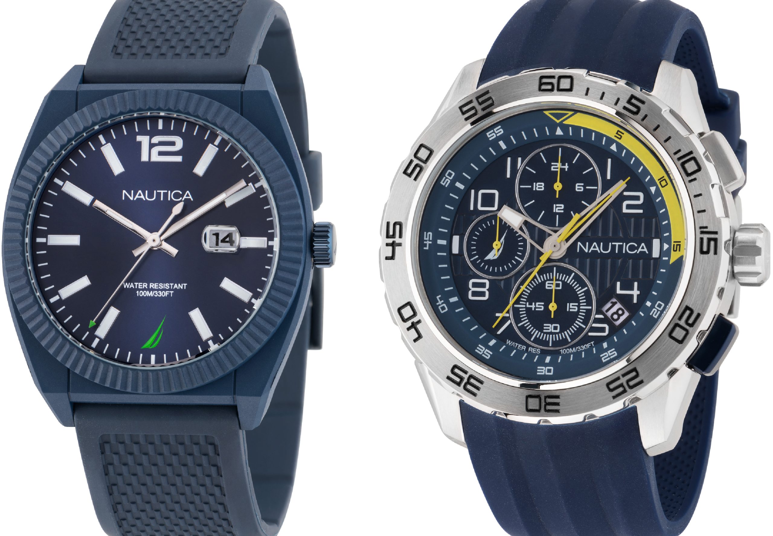 Nautica: nel Pacific Beach cassa in ecoceramica blu ø 41 mm, cinturino in tessuto operato, movimento Seiko al quarzo. Imponente con ø 47 mm il cronografo NST101 cassa (w.r. m.100) in acciaio all’85% riciclato, cinturino in silicone operato e movimento Seiko al quarzo; €.229. Infine Interessante l’One Chrono al quarzo cassa in acciaio (anche anodizzato) ø 48 mm, quadrante blu o nero; da €.219 a € 309.