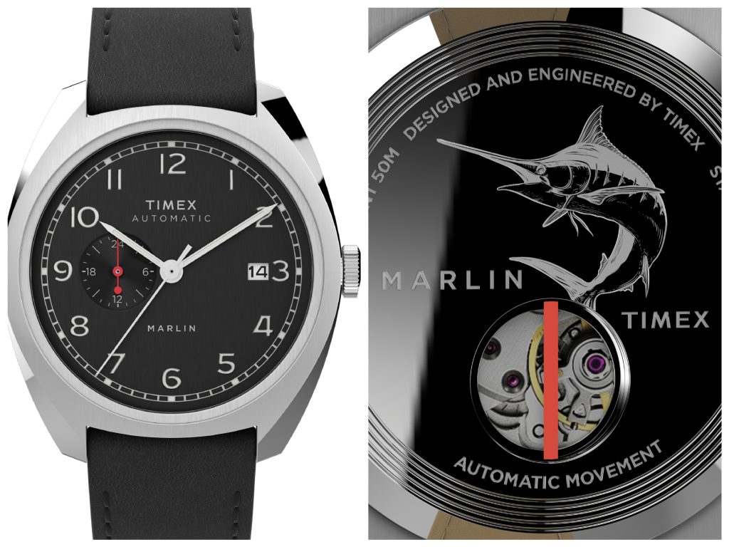 Timex:il nuovo orologio Marlin con movimento giapponese visibile dal fondello in vetro zaffiro e con l’iconico pesce, riprende il modello degli anni ’60, cassa in acciaio ø 39 mm, quadrante nero indici arabi, lancette bianche, rossa per le 24 h.