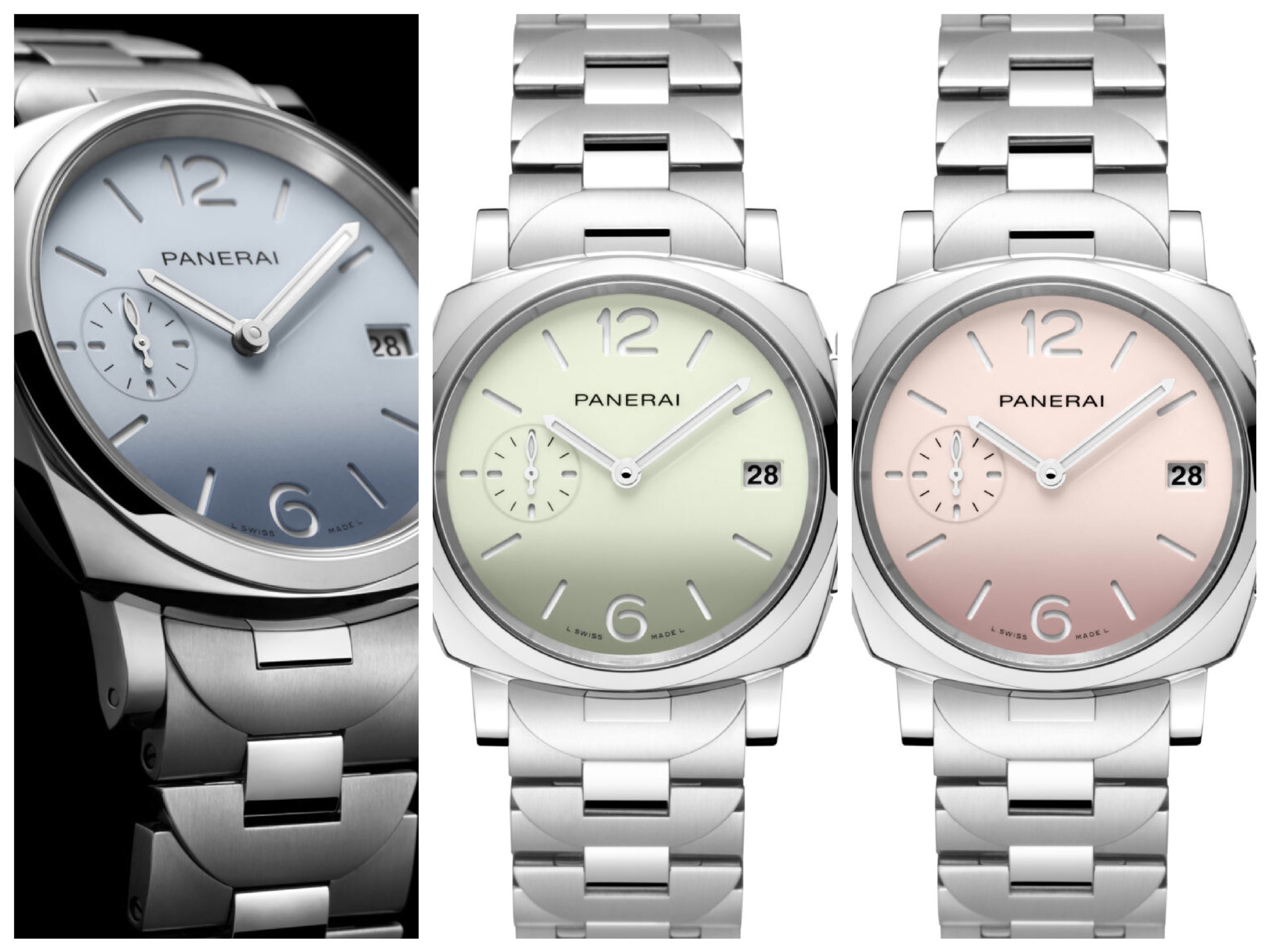 Per la prima volta Panerai sceglie quadranti in colori pastello e lo fa con le versioni più adatte ai polsi sottili, cassa in acciaio ø 38 mm.