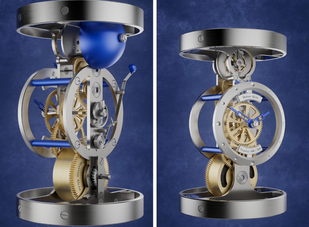 La pendulette Blu selezionata per il G.P.H.G. in acciaio e alpacca, dipinta con colore traslucido, è stata realizzata in 500 esemplari, misura 100×161 mm ha uno spessore di 100 mm, ha la sveglia e indica ore, minuti, secondi; il movimento meccanico scheletrato a carica manuale ha 233 componenti (il 95% dei quali è opera di atelier specializzati che collaborano con la Maison Alcée), la riserva di carica arriva a 300 h, le A/h sono 18.000. È stata disegnata con l’aiuto di Thierry Ducret, uno dei migliori Ouvriers de France, realizzata con maestri orologiai della Scuola di orologeria di Morteau in Francia, e un disegnatore svizzero le ha fornito necessari suggerimenti.