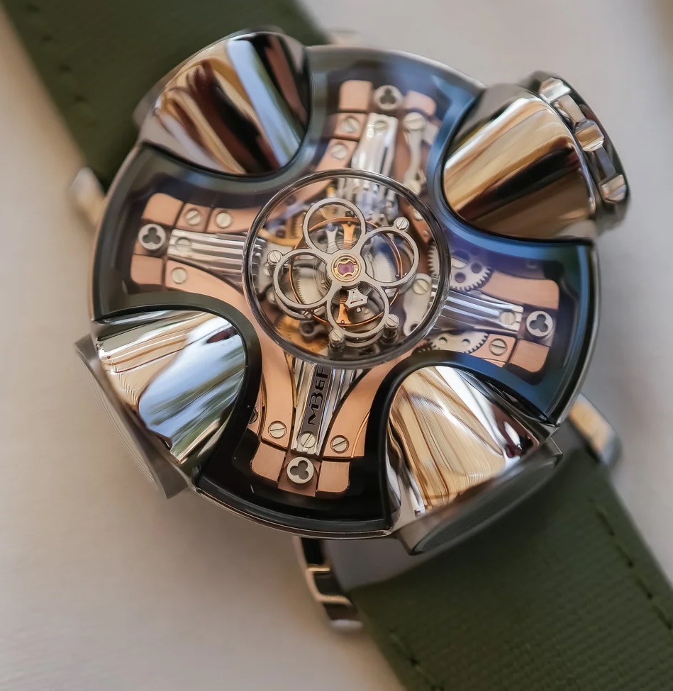 Immaginiamo che la cassa sia la pianta di un’abitazione con un ingresso al centro sul quale si affacciano 4 stanze (i coni in titanio e vetro zafffiro) e qui arrivano le prime difficoltà per l’impiego dei materiali. La metà inferiore della cassa è in titanio come i 4 coni che però devono essere pozionati dopo che sia stato inserito il movimento (per ultimare la cassa, composta da 92 elementi, occorre una settimana). In vetro zaffiro due le cupole che ricordano i lucernari delle abitazioni negli anni ’70. Nuovo l’impiego del vetro zaffiro per la corona il cui diametro è di 10 mm, consentendo così di vedere il movimento; anche qui sono intervenute diverse difficoltà poi superate, per le guarnizioni necessarie, in quanto essendo il diametro di questo componente molto grande una guarnizione tradizionale non sarebbe stata sufficiente e diverse avrebbero provocato un attrito eccessivo con conseguente rumore. MB&F è anche l’unico a impiegare come protezione 4 molle di sospensione ad alta tensione alloggiate tra il movimento e il blocco inferiore della cassa.