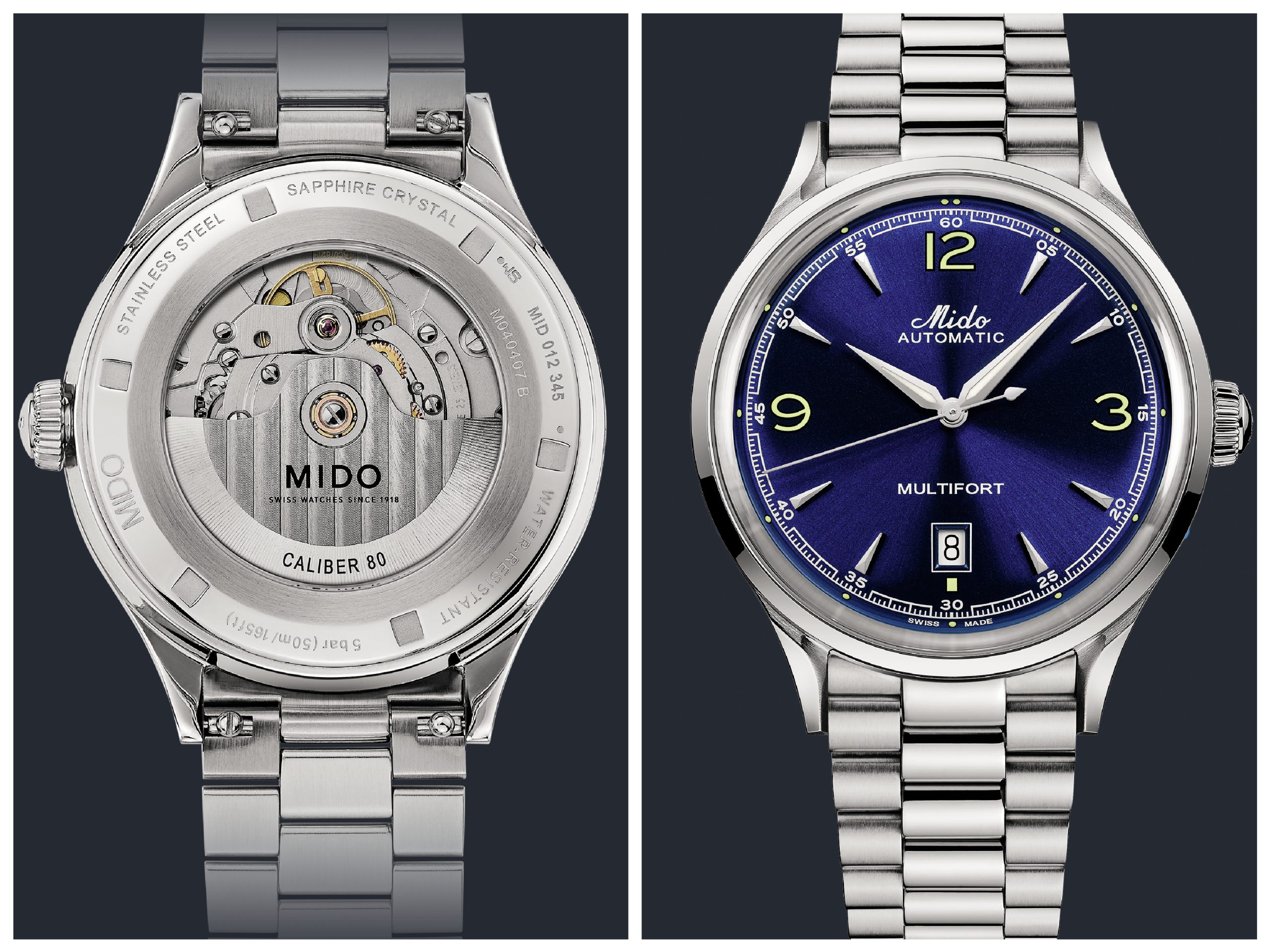 New Multifort Powerwind with steel case, ø 40 mm, and bracelet is a tribute to first Mido Selfwinding of the Fifties but movement is the modern Caliber 80; blue dial, and also a version PVD gold yellow color.