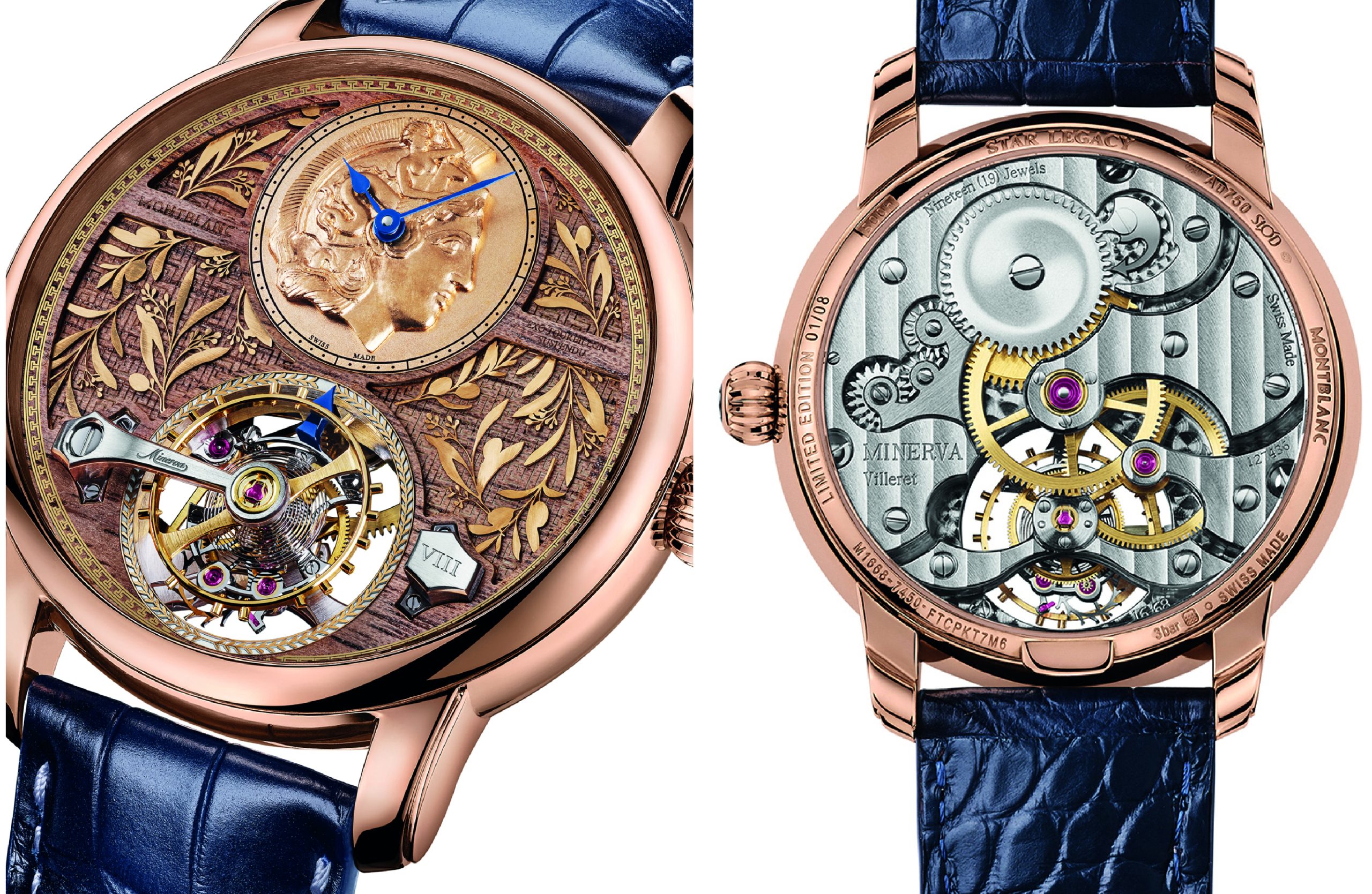 Nel nuovissimo “Montblanc Star Legacy Suspended Exo Tourbillon Minerva Limited Edition” Montblanc ha riunito diverse tecniche artigianali e orologiere (Minerva, ragione sociale dell’impresa registrata da C,.Robert nel 1887. era la dea romana non solo della saggezza e della giustizia, ma anche delle arti utili architettura, ingegneria, scienza, matematica, geometria e altro ancora). L’azienda elvetica dei fratelli Robert dopo aver attraversato con alterne fortune, due guerre mondiali e la diffusione degli orologi al quarzo, fu acquistata da Montblanc che ne fece, con l’Institut d’Haute Horlogerie, un fiore all’occhiello affidandone la direzione al Maestro italiano Dimitri Cabiddu responsabile della produzione Gerald Genta sino alla vendita di questo Marchio al distributore asiatico. Da qualche anno Cabiddu è in pensione, ma il testimone è passato in buone mani
