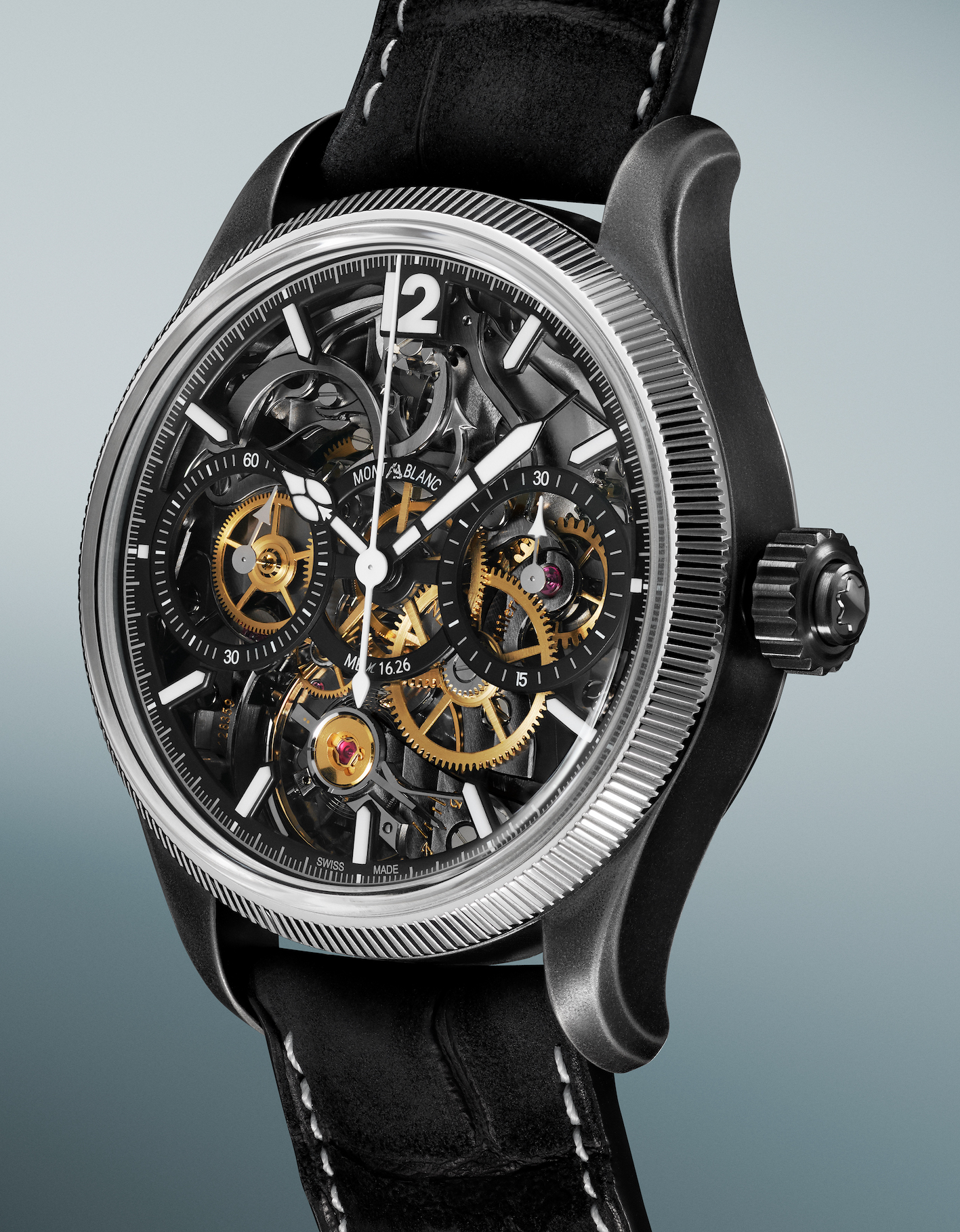 Minerva, nata nel 1887 e acquistata dal gruppo Richemont nel 2006, ha portato gli orologi Montblanc nell’Alta Orologeria. Lo storico calibro 13-20 presentato nel 1923, è stato modificato eliminando i due tradizionali pulsanti; le funzioni cronografiche si attivano ruotano la lunetta scanalata in oro bianco, che riprende quella del 1858 Minerva Monopusher Chronograph Red Arrow; è unidirezionale (un primo scatto avvia la cronografia, un secondo la ferma il terzo la azzera), compie 30 scatti per ogni giro completo, in un giro si possono cronometrare 10 eventi separati e ne è stata avanzata richiesta di brevetto. La cassa Lime Gold Au750 satinato e lucido, ø 42 mm ( nello stesso metallo anche corona e fondello) ha il fondo in vetro zaffiro sul quale sono state incise le date più importanti della Maison. Il movimento è il Calibro di manifattura Montblanc MB M13.21, a carica manuale. A/h 18.000, rubini 22, carica circa 60 h. Il quadrante è blu con numeri arabi e indici bianchi luminescenti, scala tachimetrica e telemetrica. Il cinturino è in alligatore blu. Il Montblanc 1858 The Unveiled Timekeeper Minerva Limited Edition, è stato realizzato in soli 28 esemplari. Con la cassa in acciaio, lunetta in oro bianco e quadrante verde scuro, ne è stata invece presentata l’edizione in tiratura limitata a 100 esemplari.