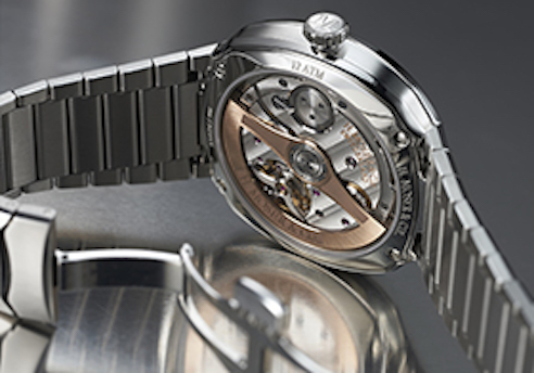 Il movimento è il Calibro HMC 200 a carica automatica, spessore 5,5 mm, A/h21.600, rubini 27 e massa oscillante bidirezionale in oro rosa con incisione del Marchio elvetico.
