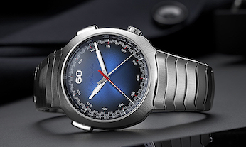 La cassa in acciaio, ø 42,3 mm (sempre w.r. a 12 ATM) della nuova versione, con analogo bracciale integrato, è protetta da un vetro bombato e mostra dal retro il movimento, il Calibro HM907 automatico flyback, sviluppato da Agenhor (azienda recentemente entrata a far parte del Gruppo pur mantenendo una sua libertà d’azione). Le A/h sono 21.600, i rubini sono 55, c’è un doppio bariletto, la carica è bidirezionale, la cronografia con ruota a colonne; la massa oscillante in tungsteno è posizionata tra il movimento e il quadrante. Su questo si vedono le funzioni cronografiche al centro.