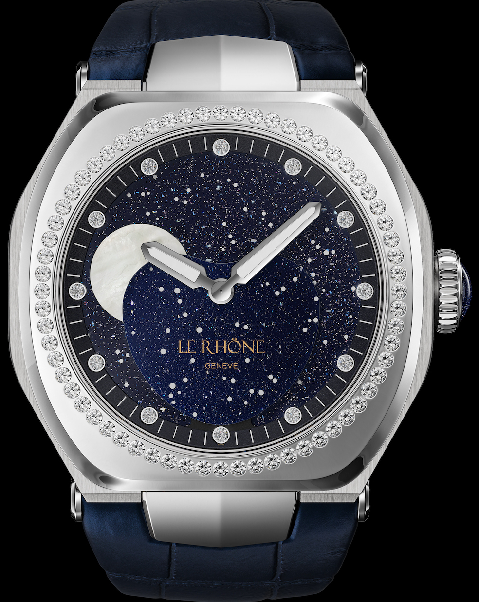 La seconda novità è un orologio dedicato alla luna. Il Moon Aventurine, foto sopra, ha una cassa ø 37 mm in titanio la cui forma unisce il design del cuscino e quello ottagonale, alternando linee rette e curve, superfici lucide e satinate; non ha anse e il cinturino in alligatore è fissato con viti in titanio sulla carrure, un sistema particolare lo rende facilmente intercambiabile. Sull’ampia lunetta lucidata manualmente a specchio e che riflette la luce, sono incastonati 64 diamanti. Sul bordo del quadrante in avventurina, che sembra un cielo stellato, sono incastonati 12 indici in diamanti, le lancette sono luminescenti.