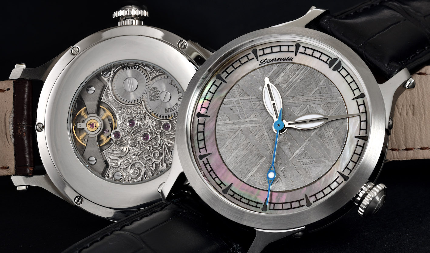 La cassa in acciaio ø 42 mm ha il vetro zaffiro con la firma segreta personalizzata Zannetti; il quadrante è in meteorite grigia oppure gialla la cui parte esterna è realizzata in madreperla con scala dei minuti e indici incisi a mano e smaltati nero.