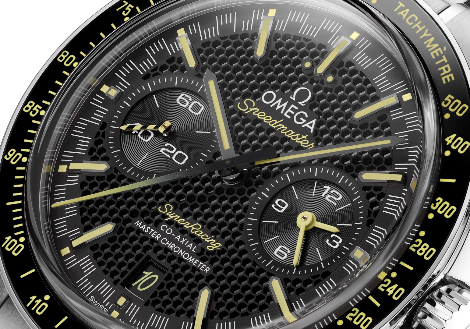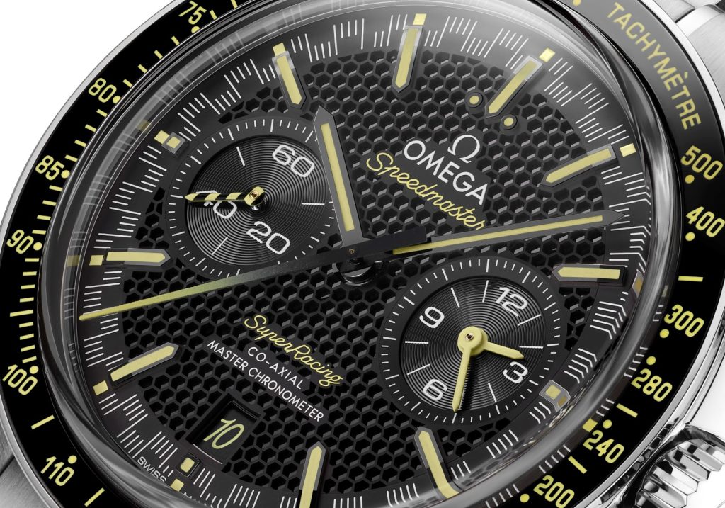 Misteri di una tecnica innovativa sui quali molti fra gli appassionati dello Speedmaster possono anche sorvolare perché di difficile comprensione, così per chi di un orologio apprezza soprattutto l’estetica, ecco i dettagli dello Spedmaster Super Racing che presenta molti riferimenti al Seamaster Aqua Terra del 2013 e al suo decennale. Per un pubblico ancora più ampio, occorrerà invece attendere i risultati di una maggiore disponibilità produttiva. Nel nuovo orologio lunetta in ceramica nera e scala tachimetrica in smalto giallo Grand Feu, colore ripreso anche nella lancetta dei piccoli secondi e in quella cronografica centrale riallacciandosi così allo Seamaster Aqua Terra del 2013. Sul quadrante a nido d’ape (nel Museo Omega a Bienne è esposto il primo orologio che resiste a campi magnetici da 160.000 gauss) il quadrantino dei piccoli secondi a ore 9 evidenzia il decennale mentre il contatore a ore 3 indica l’ora del secondo fuso orario; proprio l’anniversario ha dato origine a un altro dettaglio: nella finestrella della data ore 6, quando cambia il mese, il numero 10 si illumina con la font impiegata nel logo Speedmaster.