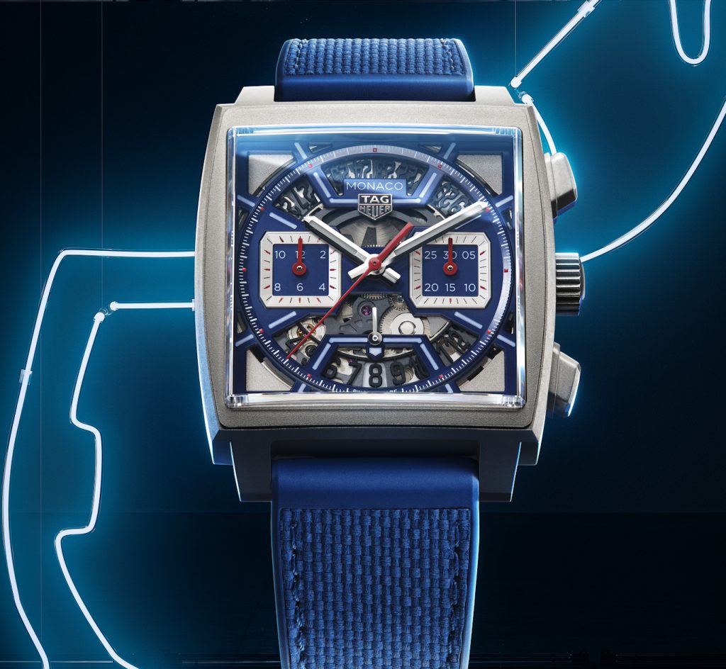 Last days of May and for people loving F1 and Ferrari tomorrow 2023 Sunday 28th is a passion day with Verstappen in pole and Leclerc 3rd. But thinking about watches this Grand Prix is mainly TAG Heuer and Monaco Chronograph, for the first time with a squelette dial in three colors: Blue, Red and Turquoise.